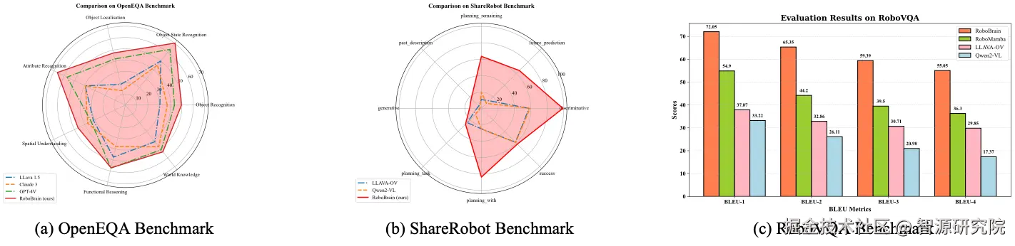 RoboBrain 在任务规划、可操作区域感知和轨迹预测评测任务中均表现出卓越性能。