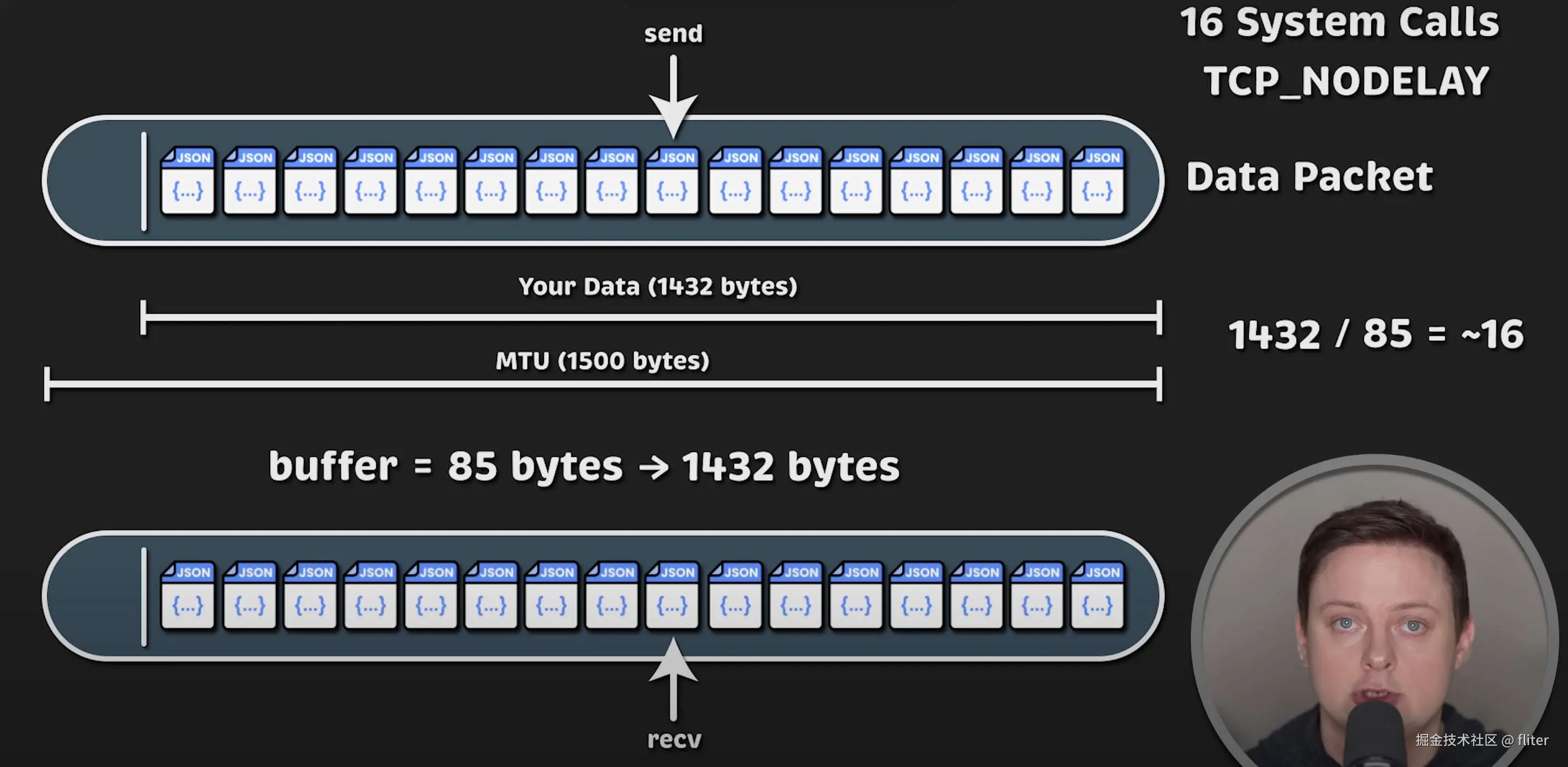 但即使关闭了,我们仍然有一个 1432 字节的缓冲区。要用 85 字节的消息填满它,大约需要 16 次 send 系统调用。