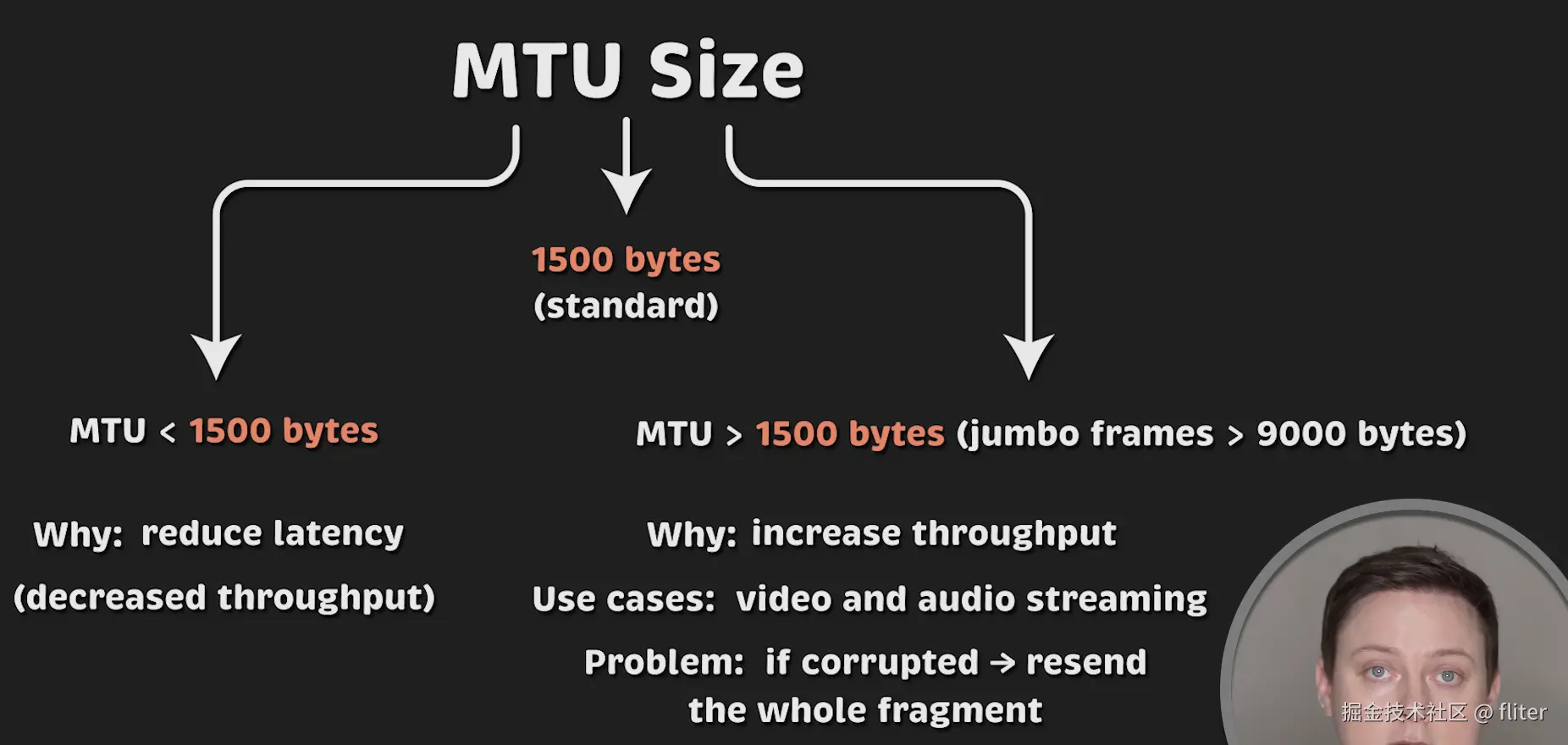 不过,使用更大的 MTU 时要注意:如果整个 9000 字节的数据包损坏,就需要重传整个数据包。1500 字节的 MTU 也会有这种情况,但需要重传的数据量更少。