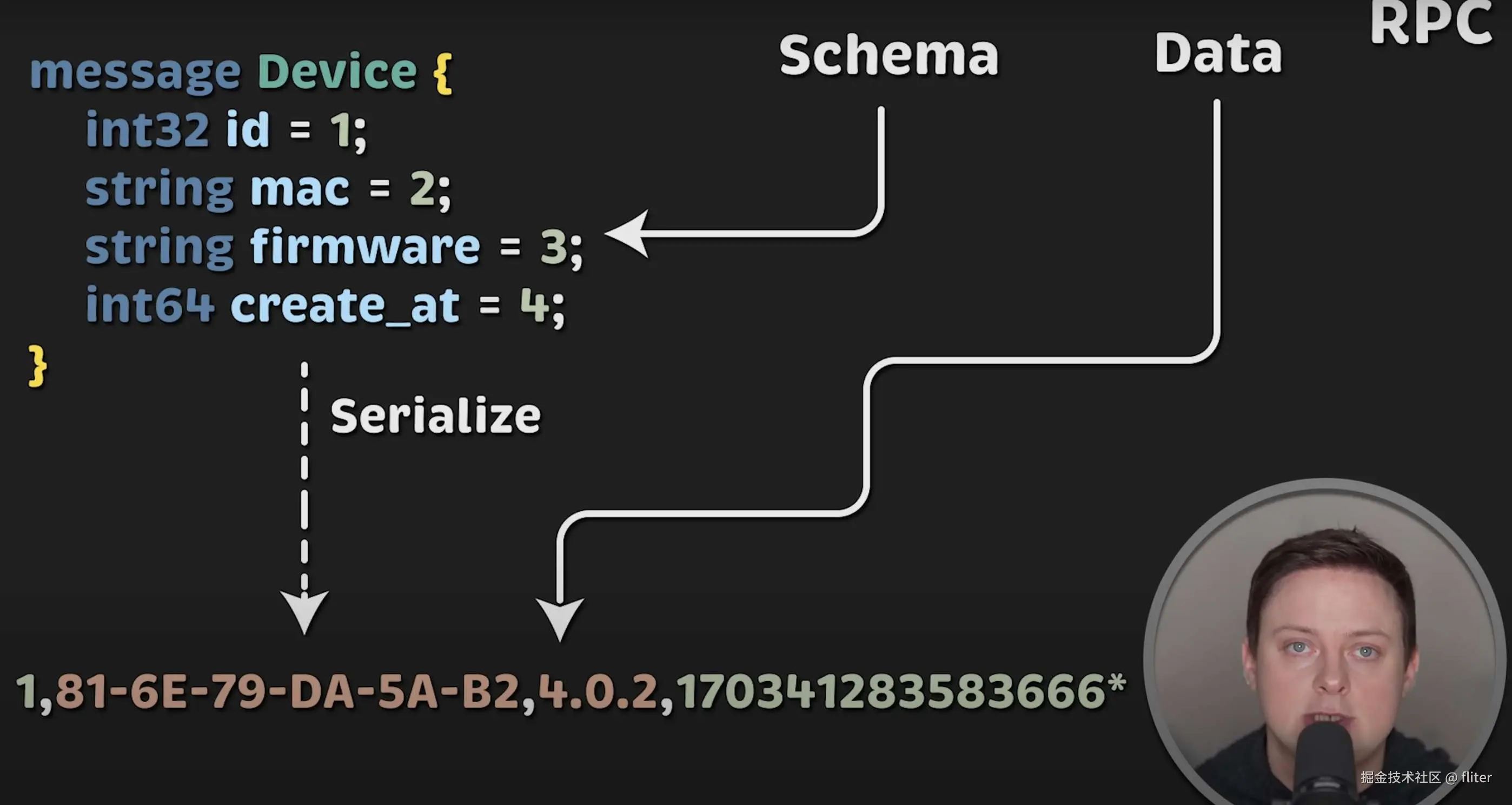 比如,相同的 JSON 消息,用 RPC 序列化后只有 38 字节,几乎是原来的一半大小。