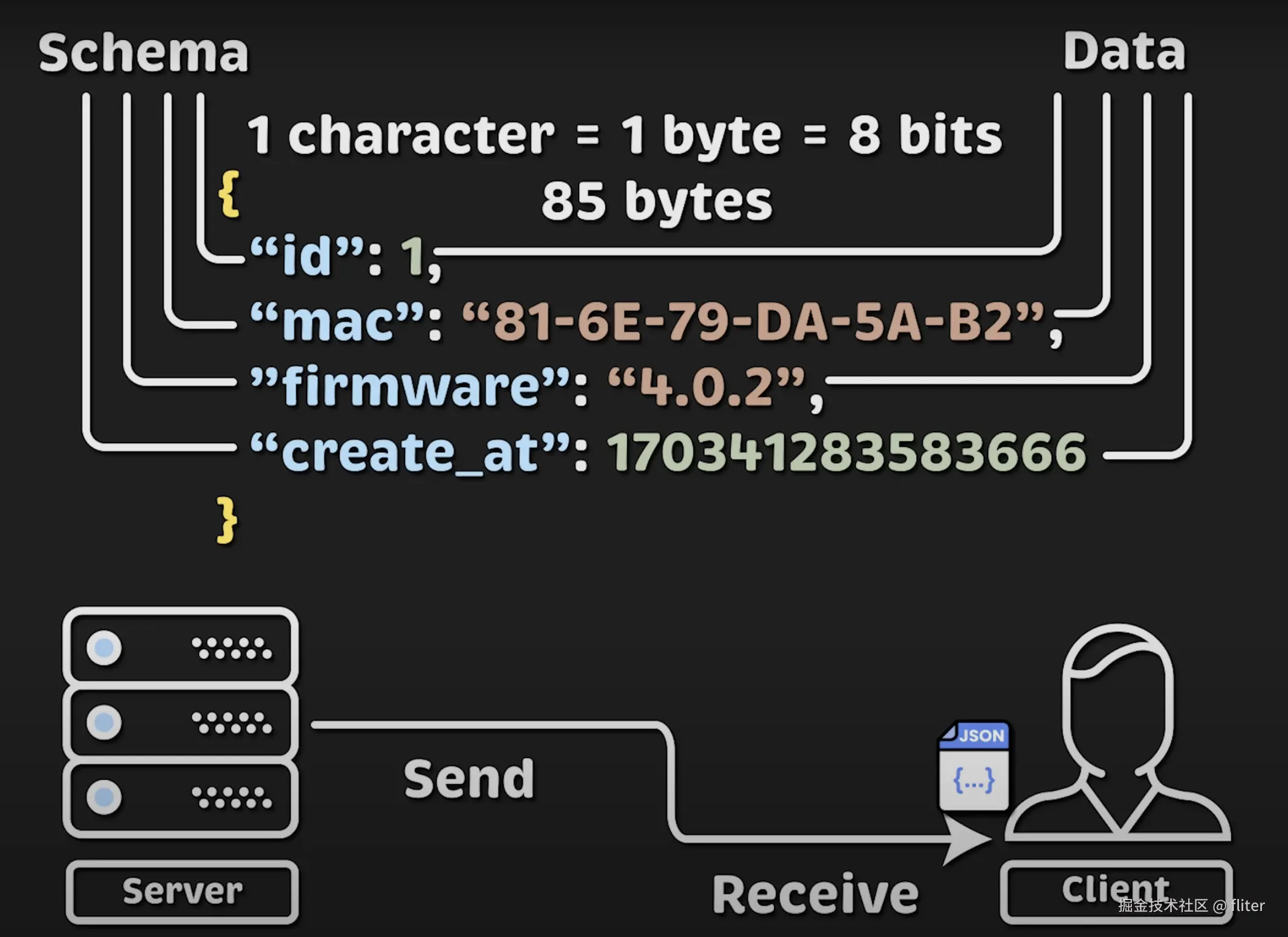JSON 包含一个结构体,键值对共同组成一个对象。每个字符占用 1 字节(8 位)。所以,去掉空格后,整个 JSON 消息大小为 85 字节。