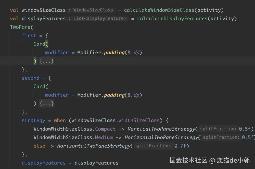 另外还可以通过 com.google.accompanist:accompanist-adaptive 的 TwoPane 进行适配,TwoPane 提供了两个固定的槽位,两个槽位的默认位置由 TwoPaneStrategy 驱动,它可以决定将两个槽位水平或垂直排列,并可配置它们之间的间隔: