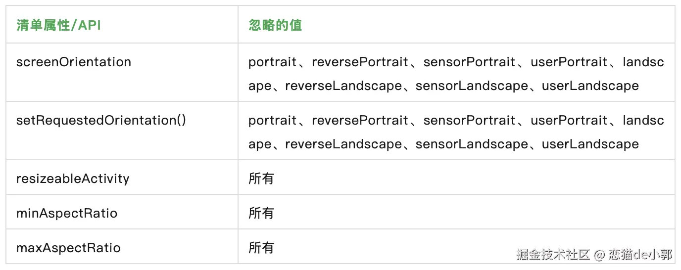具体为 TargetSDK >= 36 之后,在 sw >= 600dp 时,以下配置和 API 将被忽略: