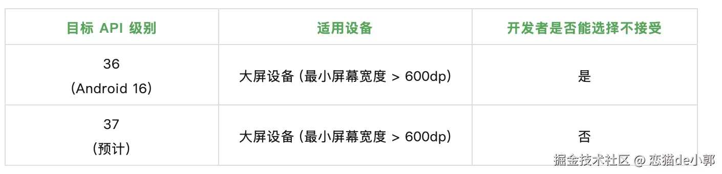 - Android 16 (2025):在 API 36 下可以配置不适配