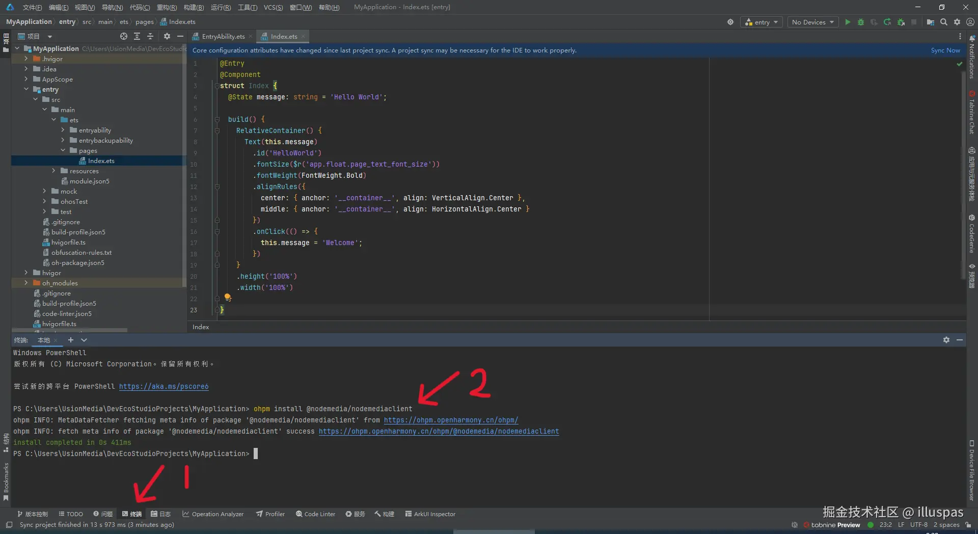 使用DevEco打开项目后,点击下方Terminal,输入命令安装依赖