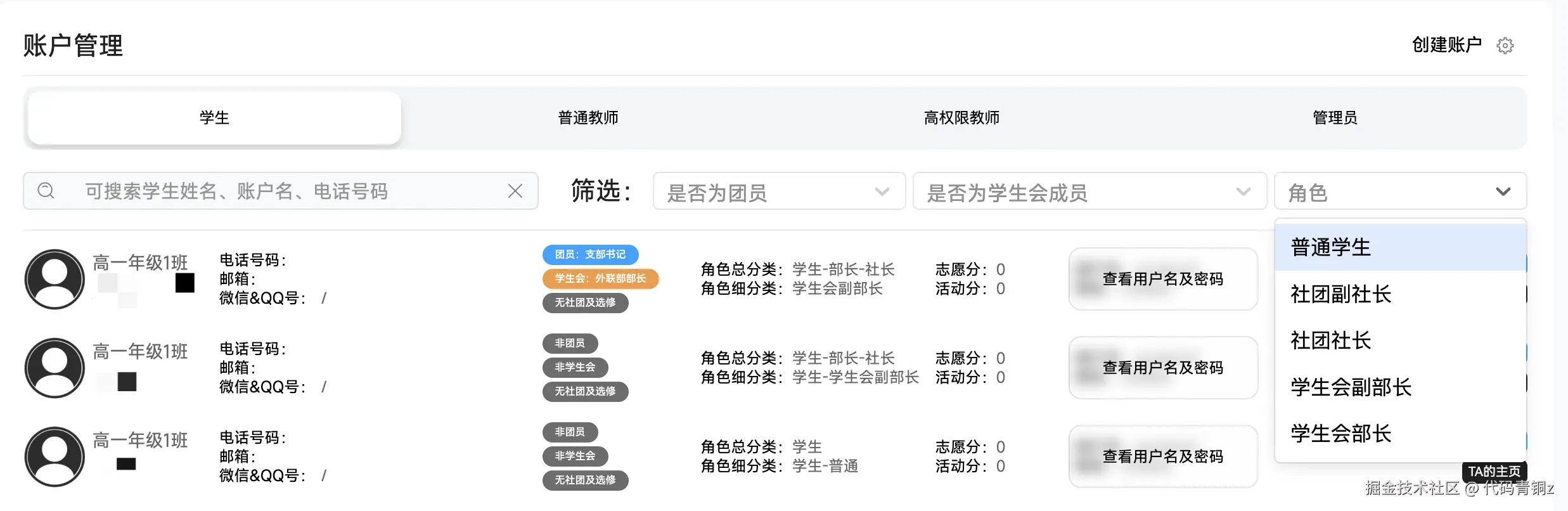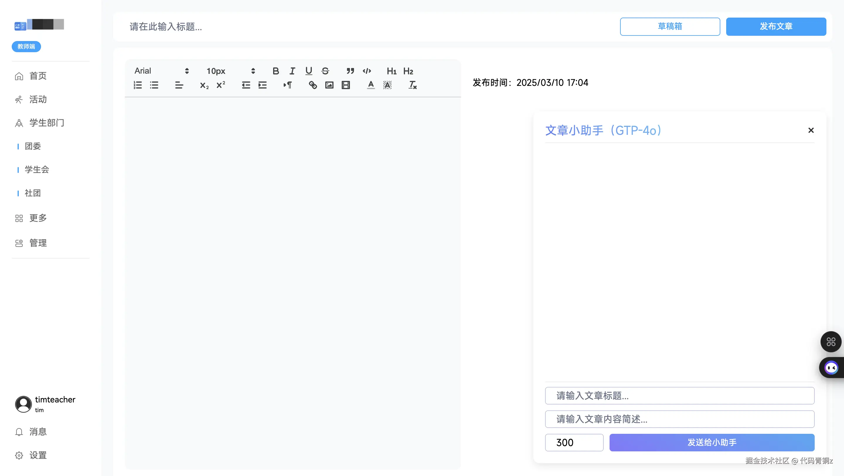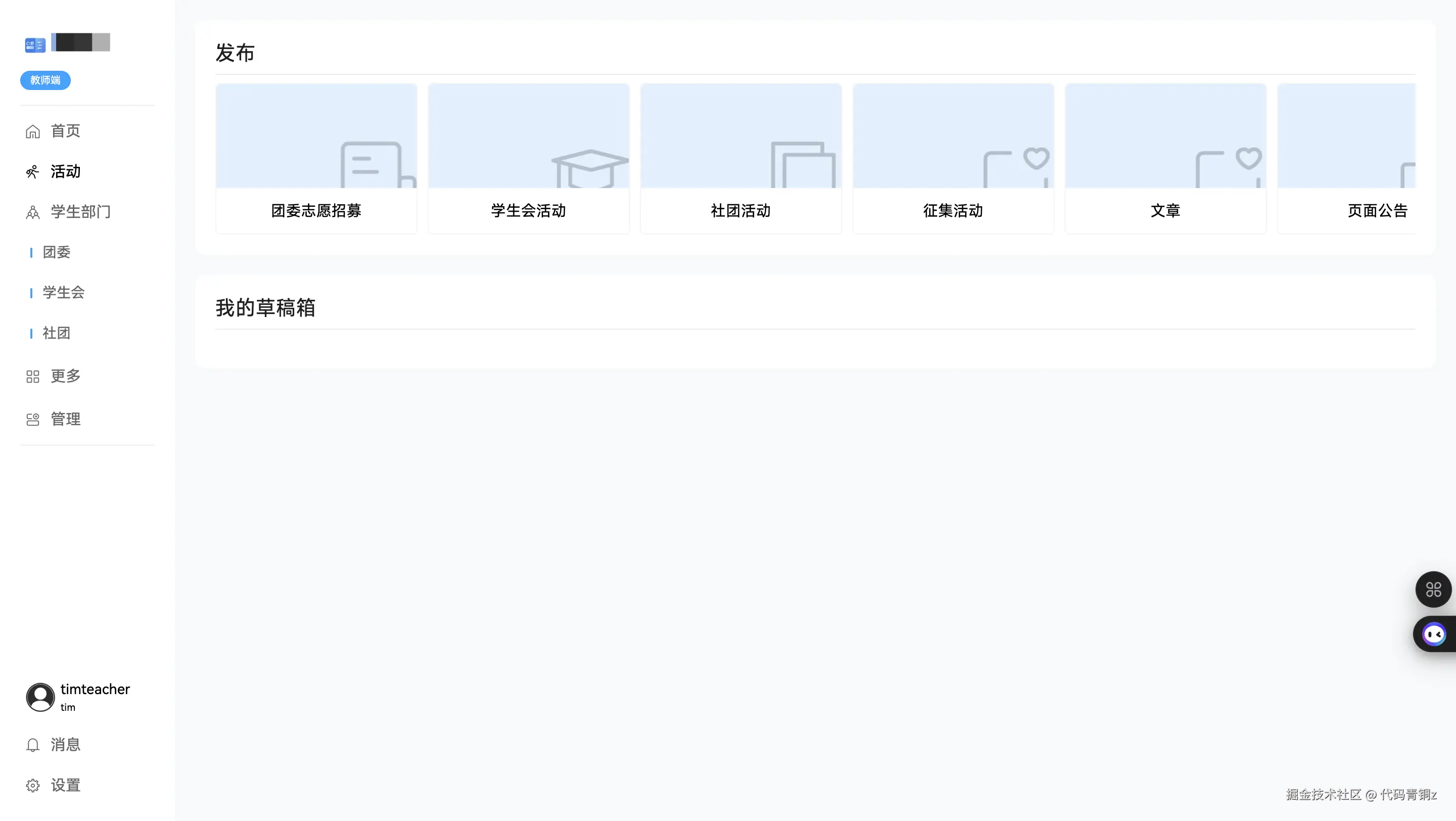 他为这套系统规划了多个核心模块,包括教师端的活动与文章发布、宣传部的公告管理、学生会的社团和纪律分管理等。学生端则围绕这些功能进行交互,形成一个完整的校园活动生态。