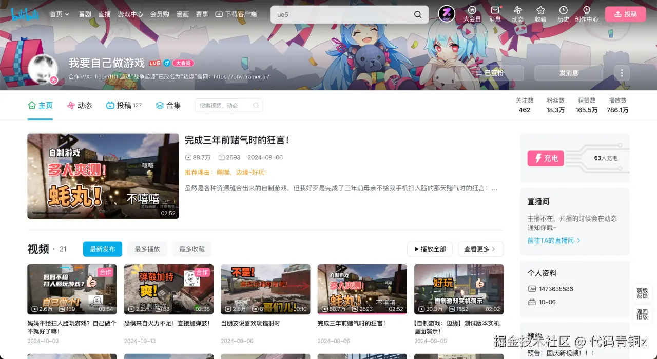 他说干就干。在B站,他立下flag,账号名也改成了“我要自己做游戏”,并发布了一个视频。没想到,这个视频一夜之间爆了,播放量破百万,20万粉丝的关注,成了他持续开发的动力。