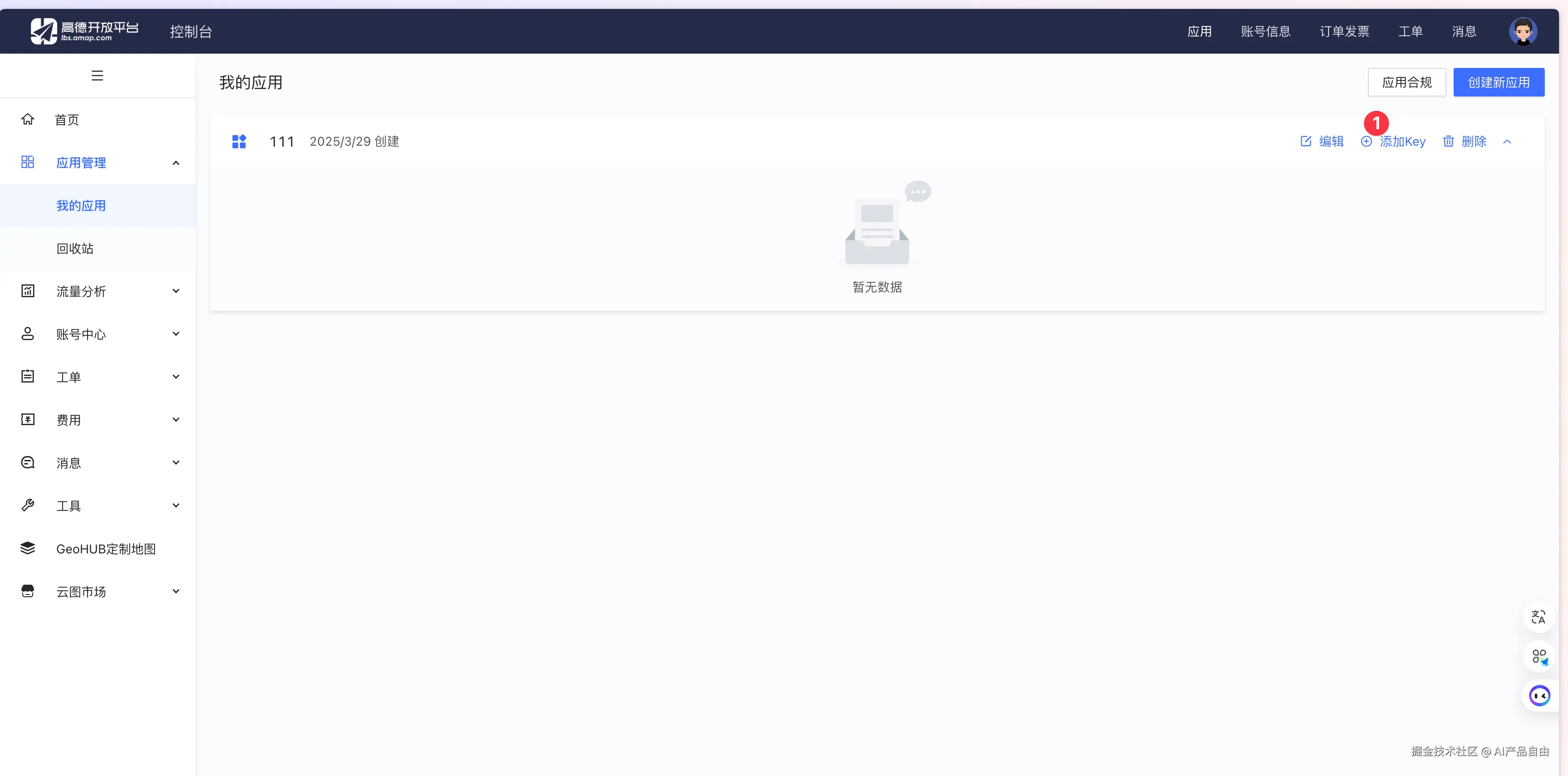 接下来,我们要创建一个应用,高德地图创建应用的目的是,如果我们有很多APP要用,分类型就好管理了