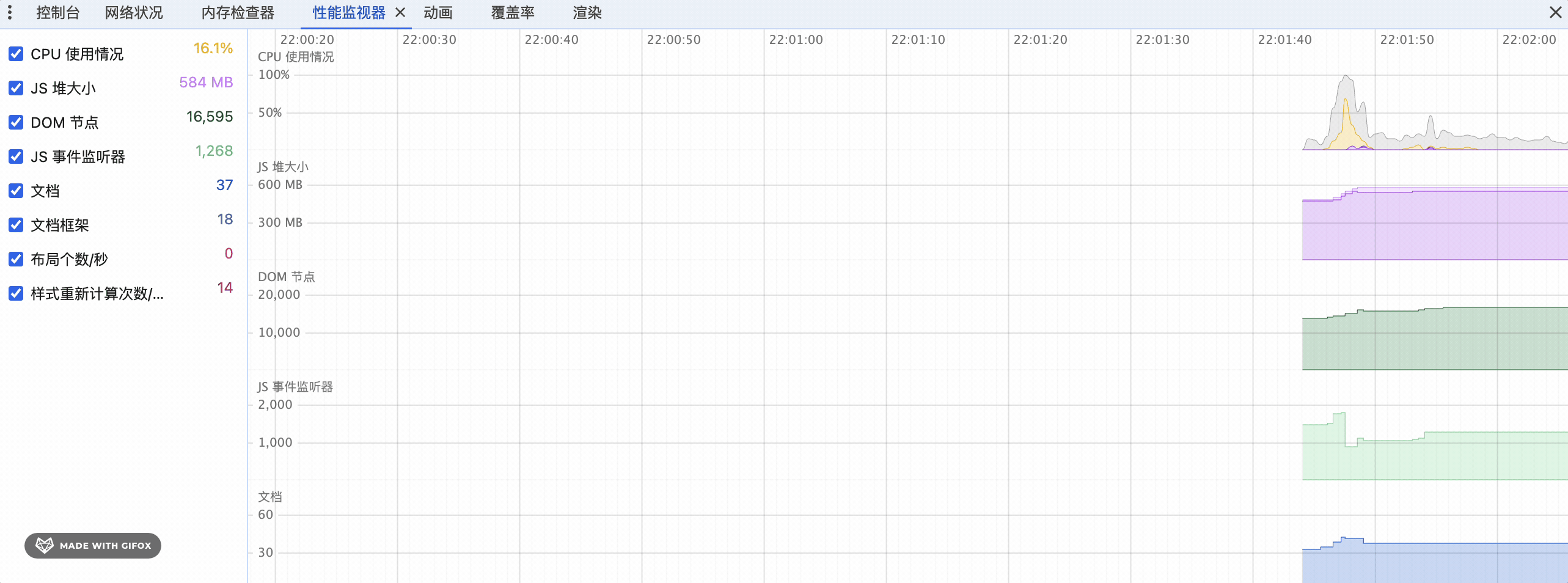 当你页面遇到性能问题,或者有些内存泄露或者卡死的情况,可以通过性能监视器去看看页面在渲染过程中的各项数据情况