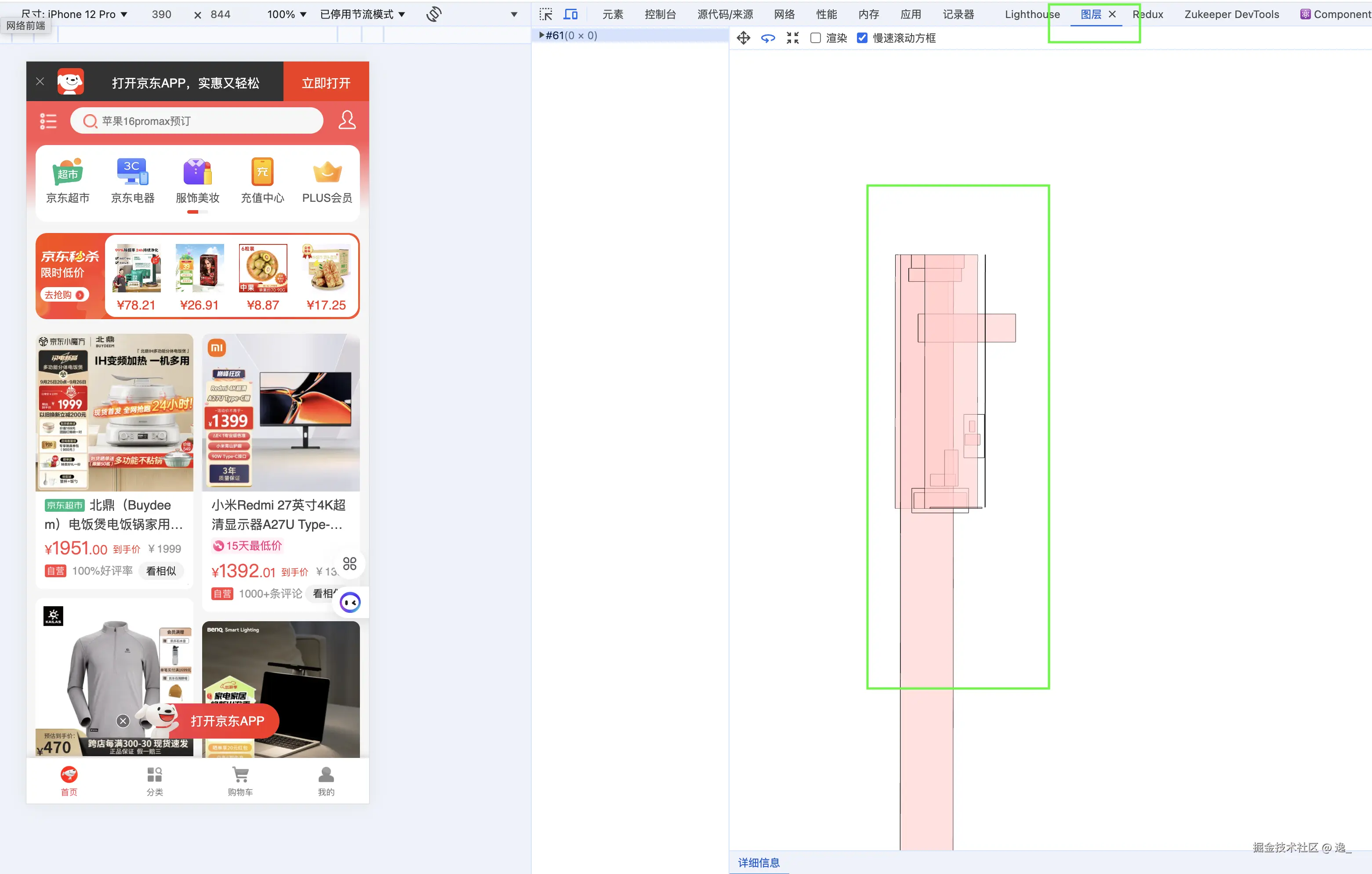 这块可以通过旋转看整个页面的层级渲染情况,chrome 的渲染路径是先绘制各种层级,然后最后整体提交,以前叫复合,我感觉复合更加形象一些,把多这个层最后汇合成图像!,怎么去创建单个层级我在这个地方不细讲,主要通过定位或者加一些 css 属性,比如will-change 这种方法去告诉浏览器我要这块内容单传创建一个层级渲染,这样的好处就是减少页面的布局和重绘,只对部分模块进行绘制!这块比较适用于在页面中经常动的地方!