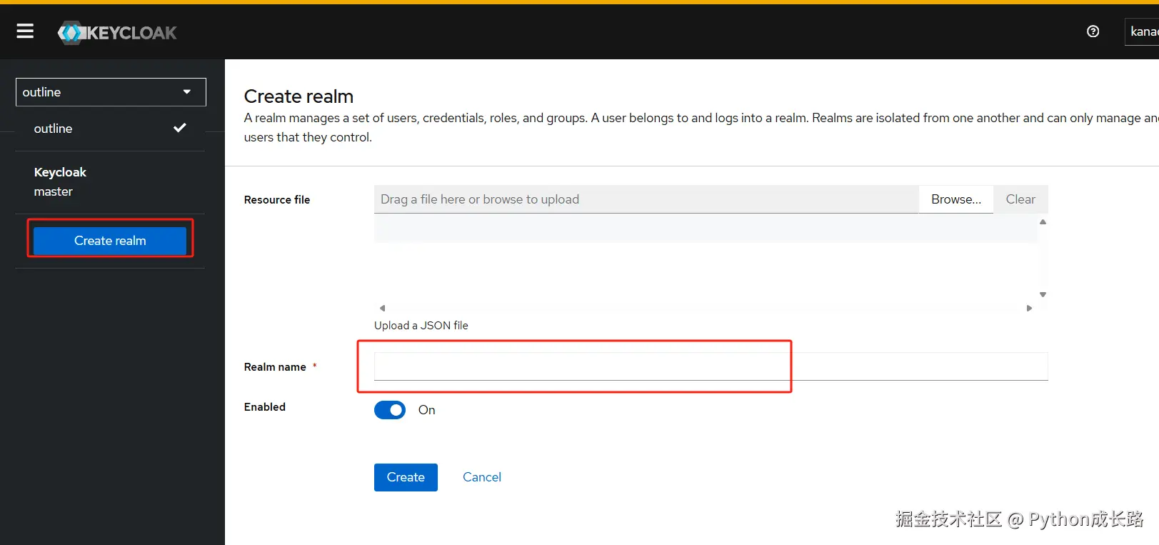 接着刷新页面就可以正常登录了,然后开始创建realm,名称填outline