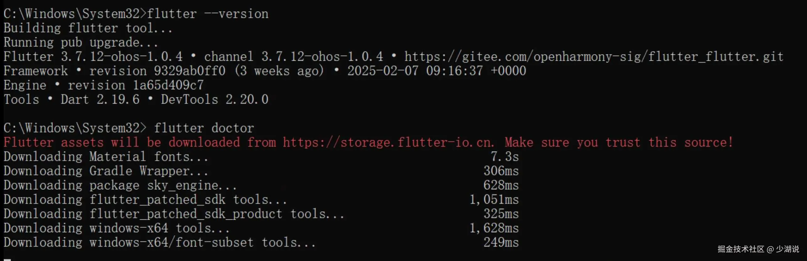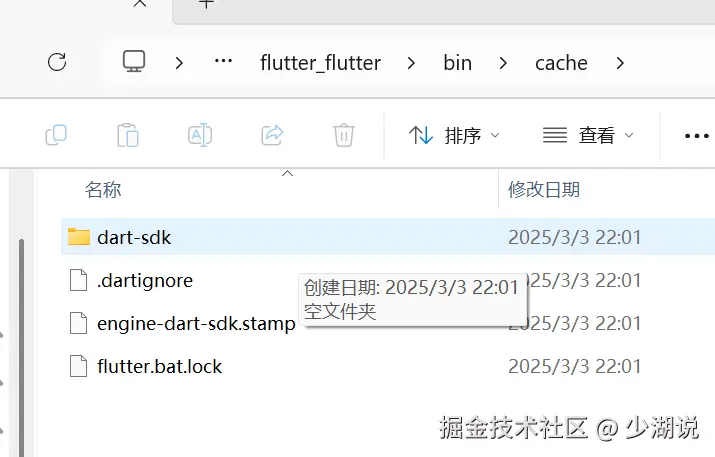 经多几分钟的摸索和分析,我决定尝试手动处理缺失的 dart-sdk,按照命令输出的 url,手动下载解压,复制到 Flutter 目录下的 cache/dart-sdk,现在看看是否能用呢?
