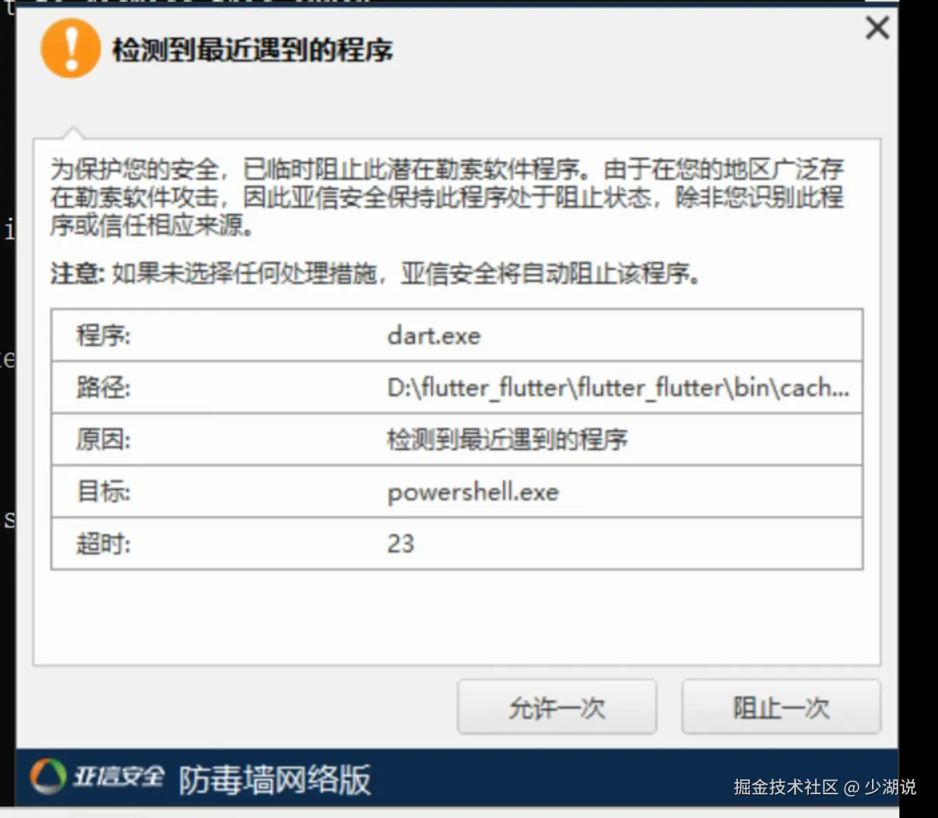 Flutter 在安装初始化和编译时会下载和生成大量文件,这就导致监控磁盘的杀软误报,这里必须要点击允许,不要因为忽略而关掉告警,否则无法往下进行。
