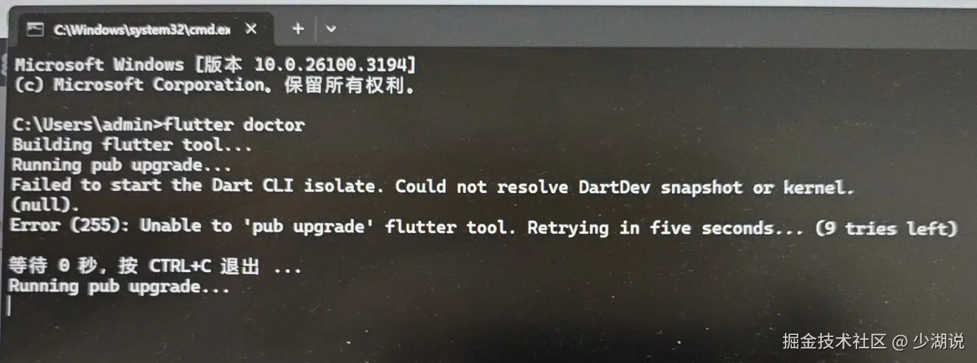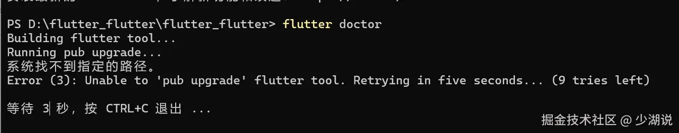 按照网上的提示,这时需要手动清理 cache,打开 Flutter 安装目录,删除 bin/cache 目录,重新运行,发现,又回到了第一次的情形。