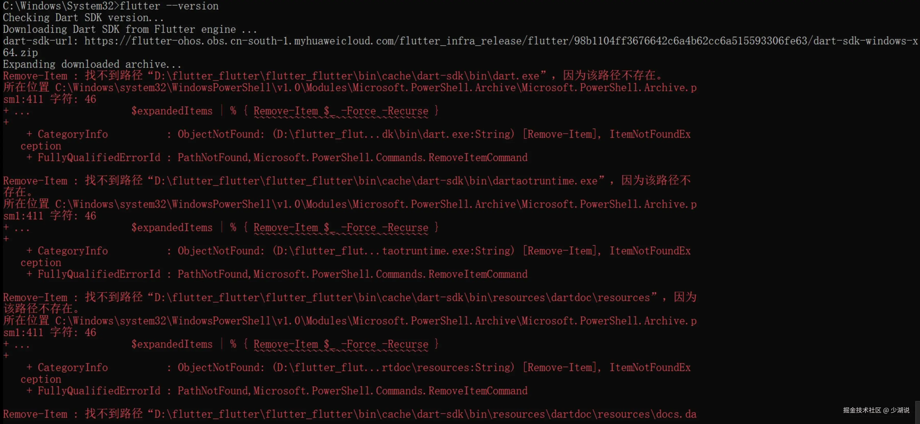 我们按照环境配置指南重新安装 sdk,使用 git 克隆 Flutter 的 dev 分支之后,运行时 flutter --version 命令,起初,输出朝着期望的方式进行,但经过短暂 Flutter engine 下载之后,出现一堆红色错误,仔细查看错误原因,dart-sdk 竟然是空的?!