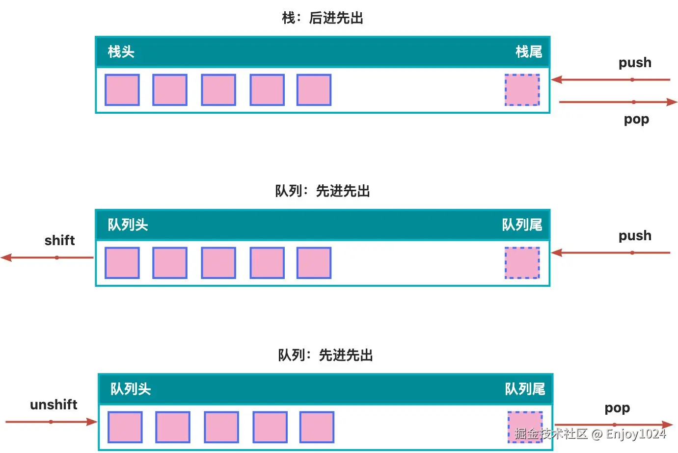 反过来,用unshift()从队列头部推入多个参数;用pop() 从队列尾部移除一个元素
