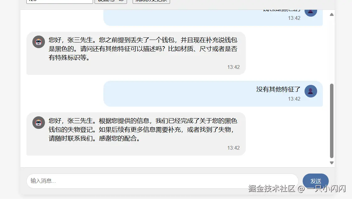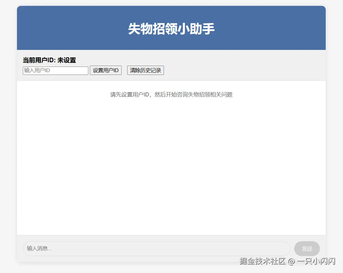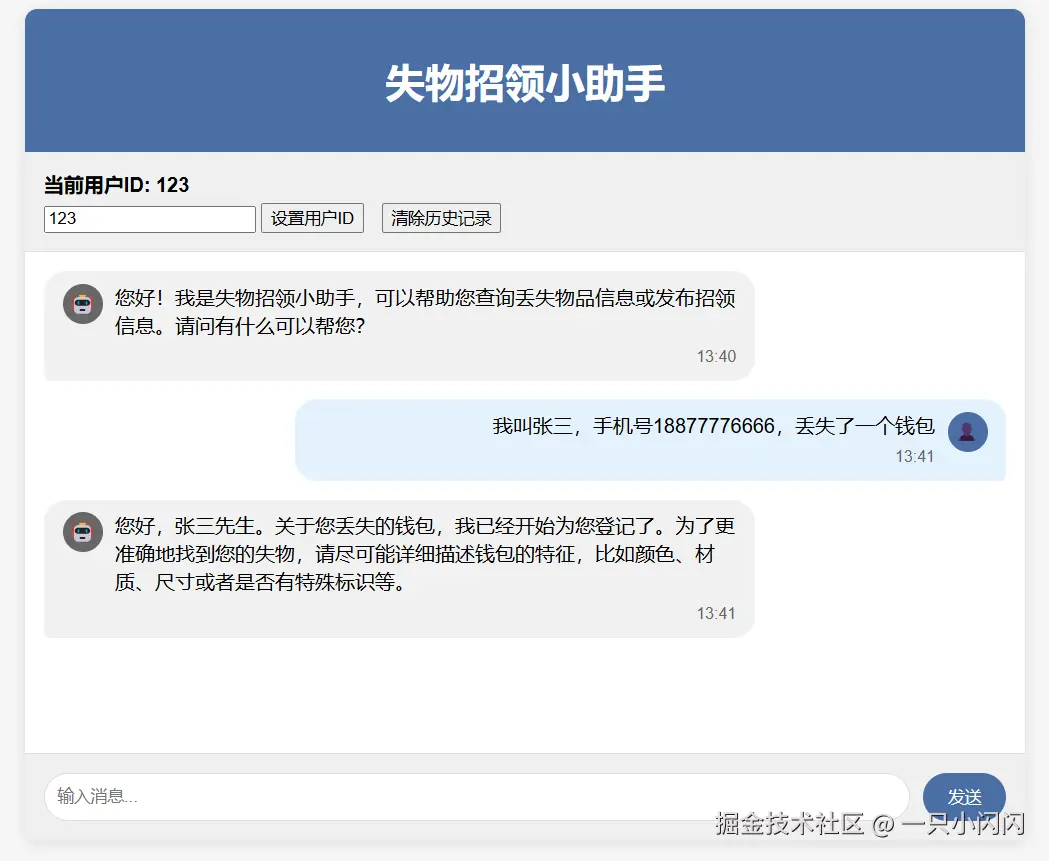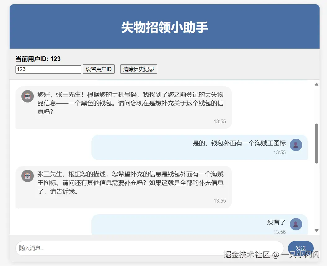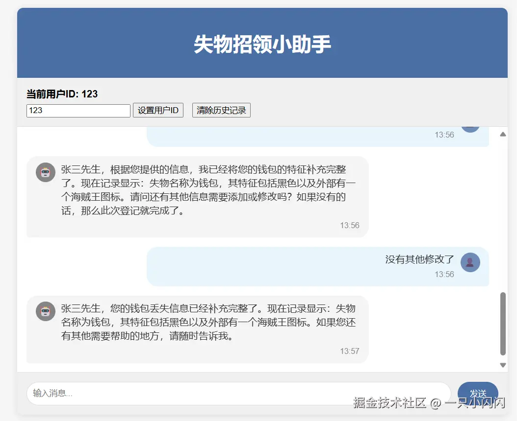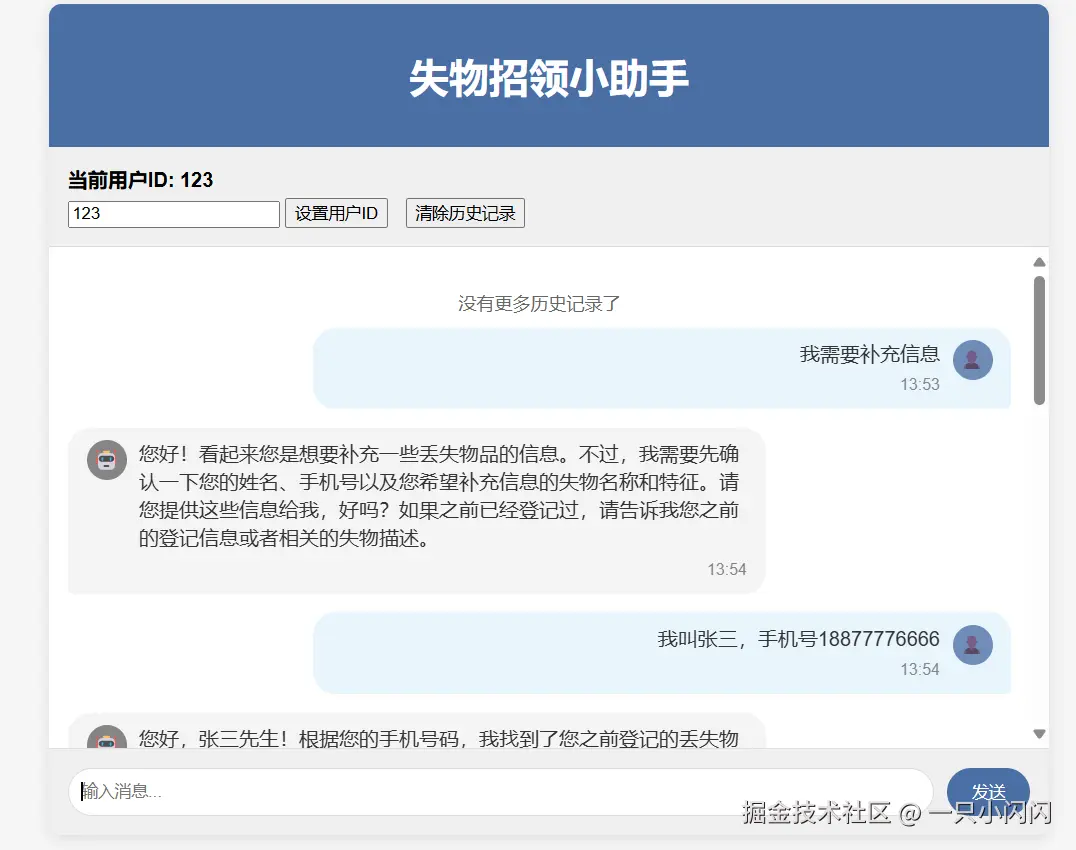 我使用了deepseek帮我生成了一个前端页面,可以查看对话历史,清除对话历史,设置完用户id就可以开始了。