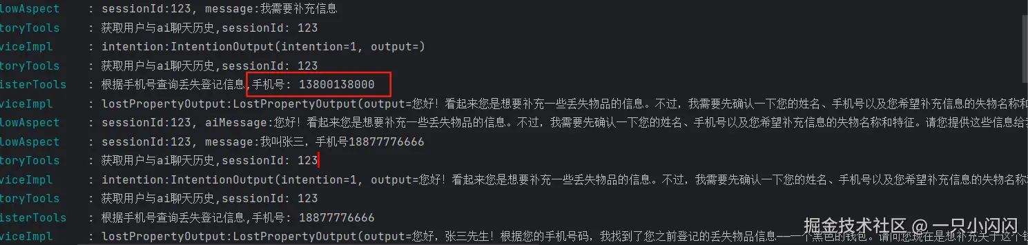 - 若用户已经输入了手机号,调用根据手机号查询丢失登记信息工具查询用户丢失物品的信息。若能查询到数据,可能有多条数据,将其与用户已输入的物品信息进行匹配(比较失物名称和失物特征是否是能匹配),最多返回一条已经匹配的数据,并填充id字段(返回记录id),并记录,判断用户意图是否为补充数据。若判断“是”,询问用户是否要补充数据。若判断“否”,则直接进入正常登记流程,无需向用户说明数据库查询情况。