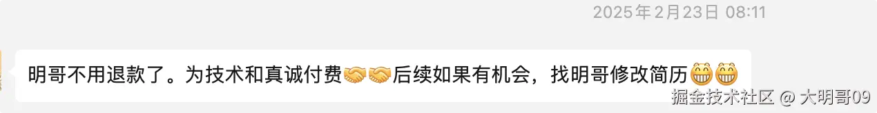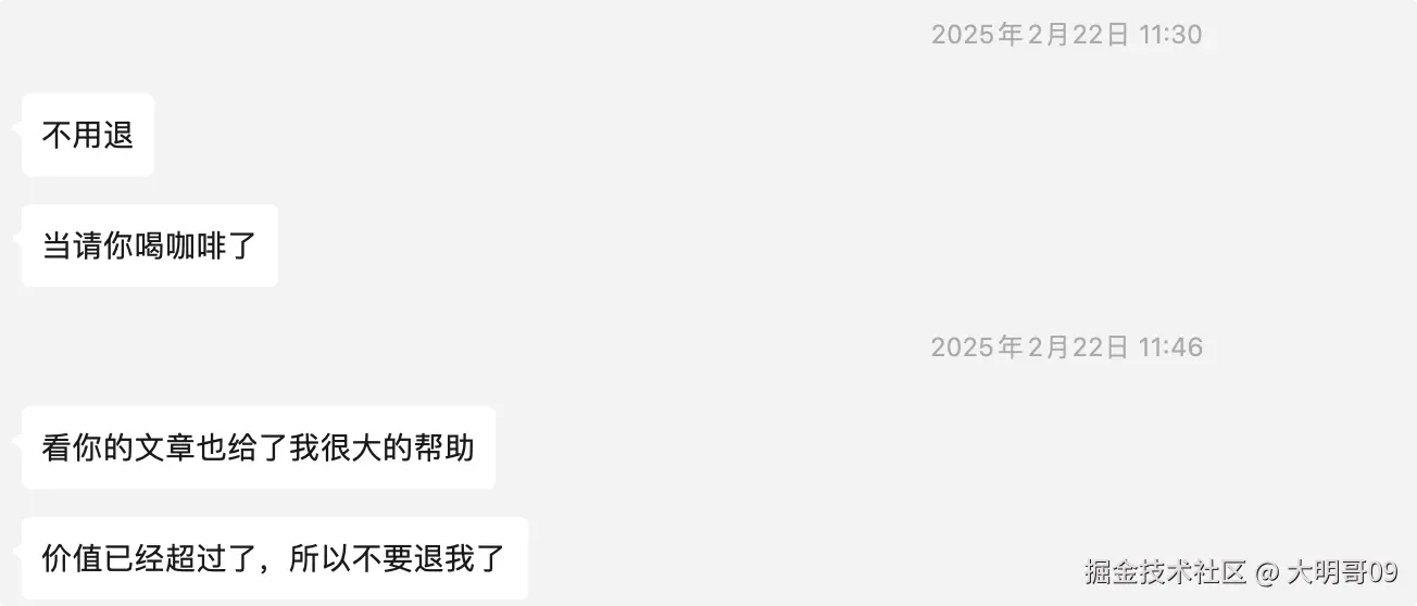 所以,在 2025.02.22 开始陆续给购买了 Java 面试宝典的小伙伴陆续退款,直接全退的那种,同时 Java 面试宝典依然可读,主要是感谢他们作为我的第一波付费用户。当然,也有一些兄弟不需要我退款,或者只退部分: