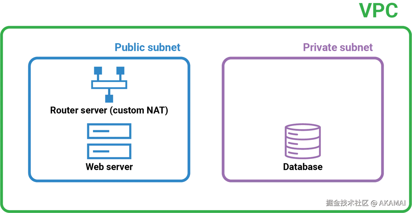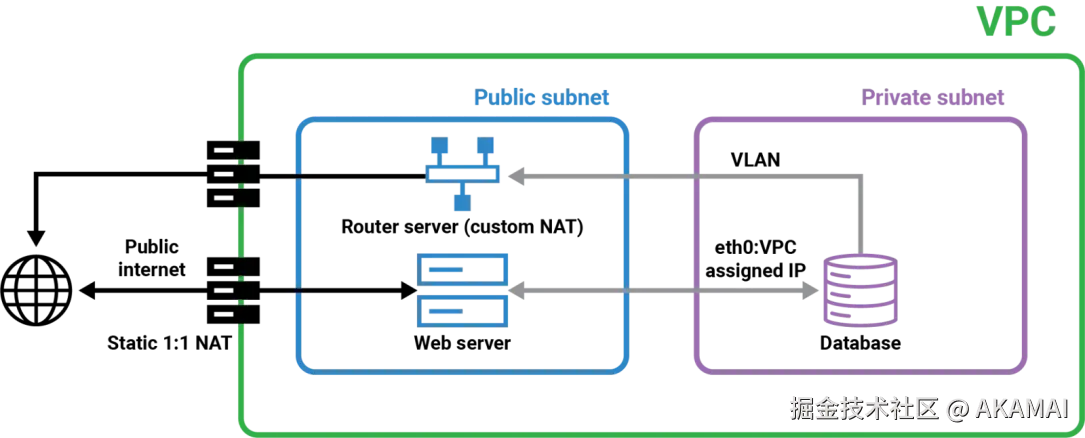 上图展示了一种典型的VPC设置,其中分为三个主要部分:VPC、公共子网(Public subnet)和专用子网(Private subnet)。首先是绿色外框,即VPC,它能将自己所容纳的资源与其他网络隔离开来。用户可以使用通过1:1 NAT分配的静态IP地址,经由公共互联网访问Web服务器。Web服务器处理请求,并在必要时与数据库服务器通信。Web服务器通过路由服务器与数据库服务器通信。路由服务器使用自定义NAT在公共子网和私有子网之间安全地路由流量。位于专用子网的数据库服务器通过VLAN接收来自Web服务器的请求。专用子网的隔离功能确保了数据库服务器不会直接暴露在互联网上,从而提高了安全性。