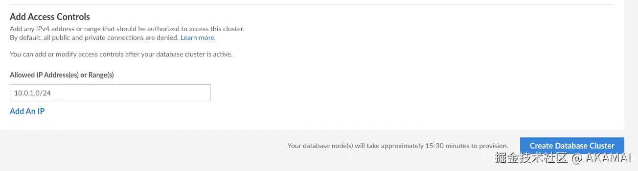 请注意:该数据库不能像其他服务器一样直接访问公共互联网。在页面底部的Add Access Controls选项中,我们可以为上面创建的专用子网添加允许访问的IP地址范围。