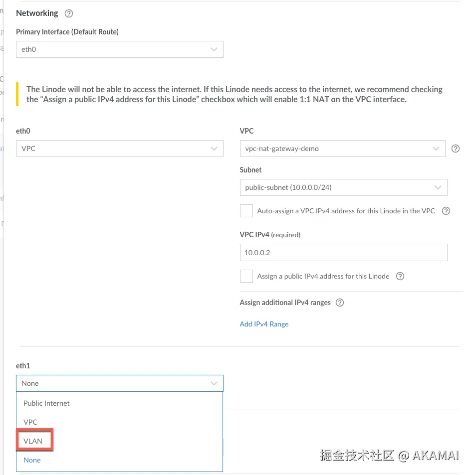 接下来需要再次执行上述操作创建Web服务器。单击Create Linode,选择为VPC所选的区域,然后将VPC分配给此实例。接下来可以看到,Web服务器和路由服务器都位于VPC的公共子网中。