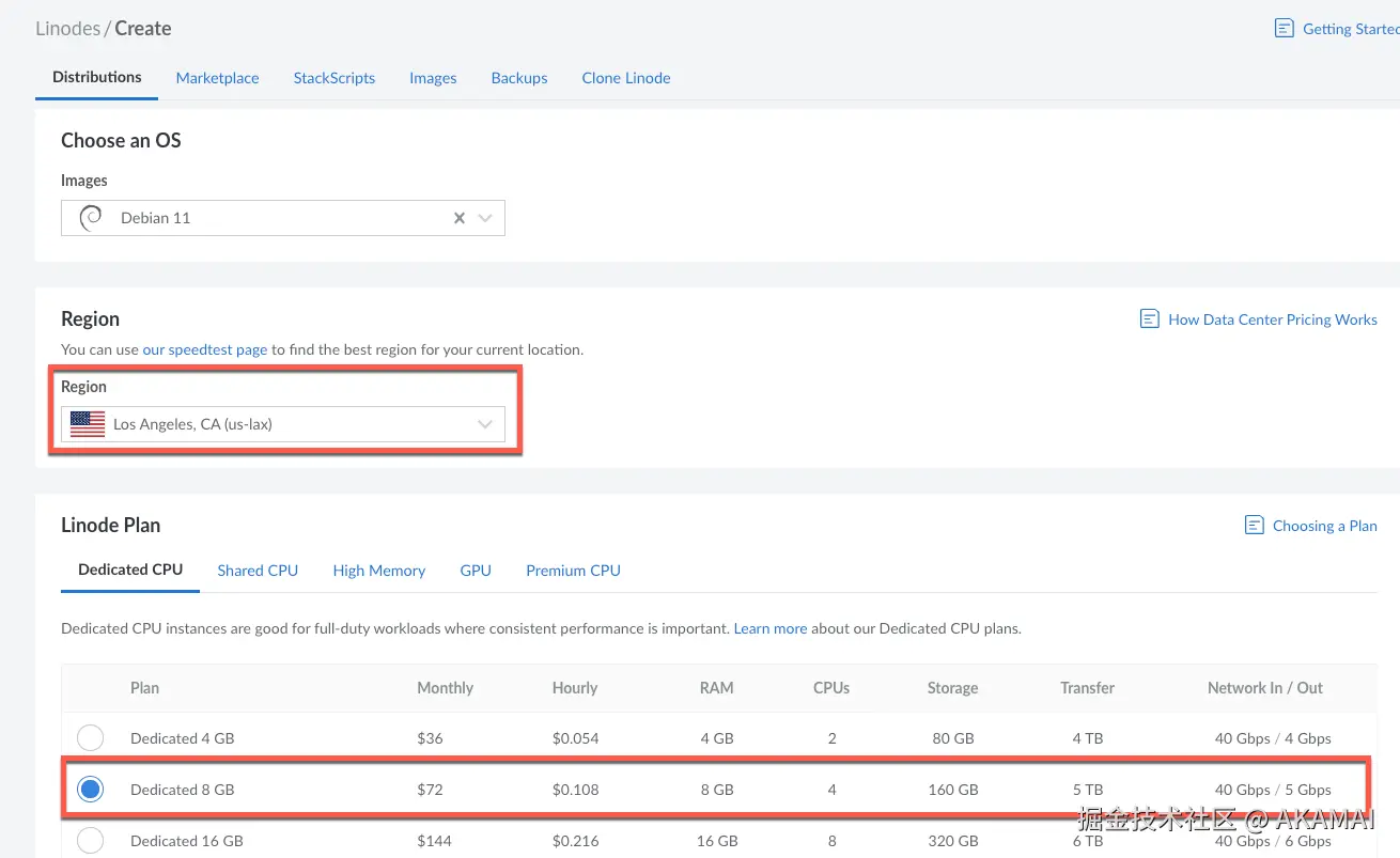 首先,我们将创建路由服务器。在Cloud Manager中,点击左侧面板上的Linodes,然后点击Create Linode。选择与创建VPC时相同的区域,然后选择Dedicated 8 GB CPU选项。