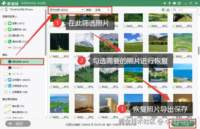 步骤2:耐心等待扫描的完成,在扫描结果中选择 【相机胶卷】 ,筛选找到需要的照片进行恢复,恢复好的照片可以导出至电脑保存,可通过将照片发送到手机重新下载并保存到相册。