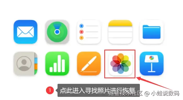 步骤2:在iCloud网站的主界面中,点击 【照片】 应用。浏览并选择您想要恢复的照片,点击界面右上角的下载按钮进行恢复。