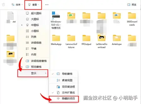通过【此电脑】打开SD卡,在文件资源管理器的上方点击【查看】,进入新的列表后点击【显示】,最后就能顺利看见【隐藏的项目】的选项了。