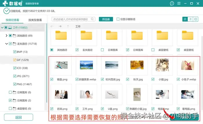 第2步:软件左上方显示扫描完成后,再在指定的位置选择出自己需要恢复的文件,点击表示勾选后,再点击【导出】,最后别忘了在弹窗选择恢复文件的新存放位置。