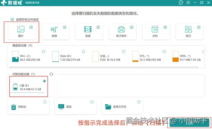 第1步:将相机SD卡通过读卡器的形式连接到电脑中,然后再打开数据 蛙恢复专家,在首页按页面提示选择好需要恢复的文件类型和扫描位置,选好再点击页面右下角的按钮;