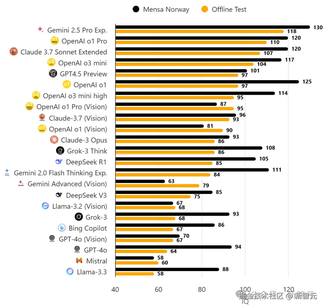 更离谱的是,在一项智商测试中,Gemini 2.5 Pro 的 IQ 竟然高达 130,离线得分也有 118 分。