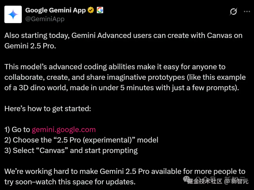 刚刚,谷歌官方宣布,Gemini Advanced 用户可以在 Gemini 2.5 Pro 中使用 Canvas 进行创作了。