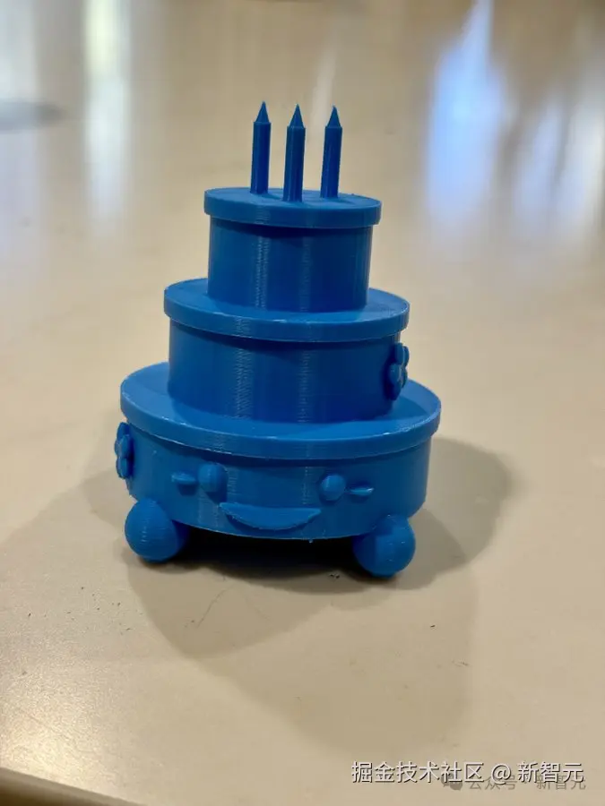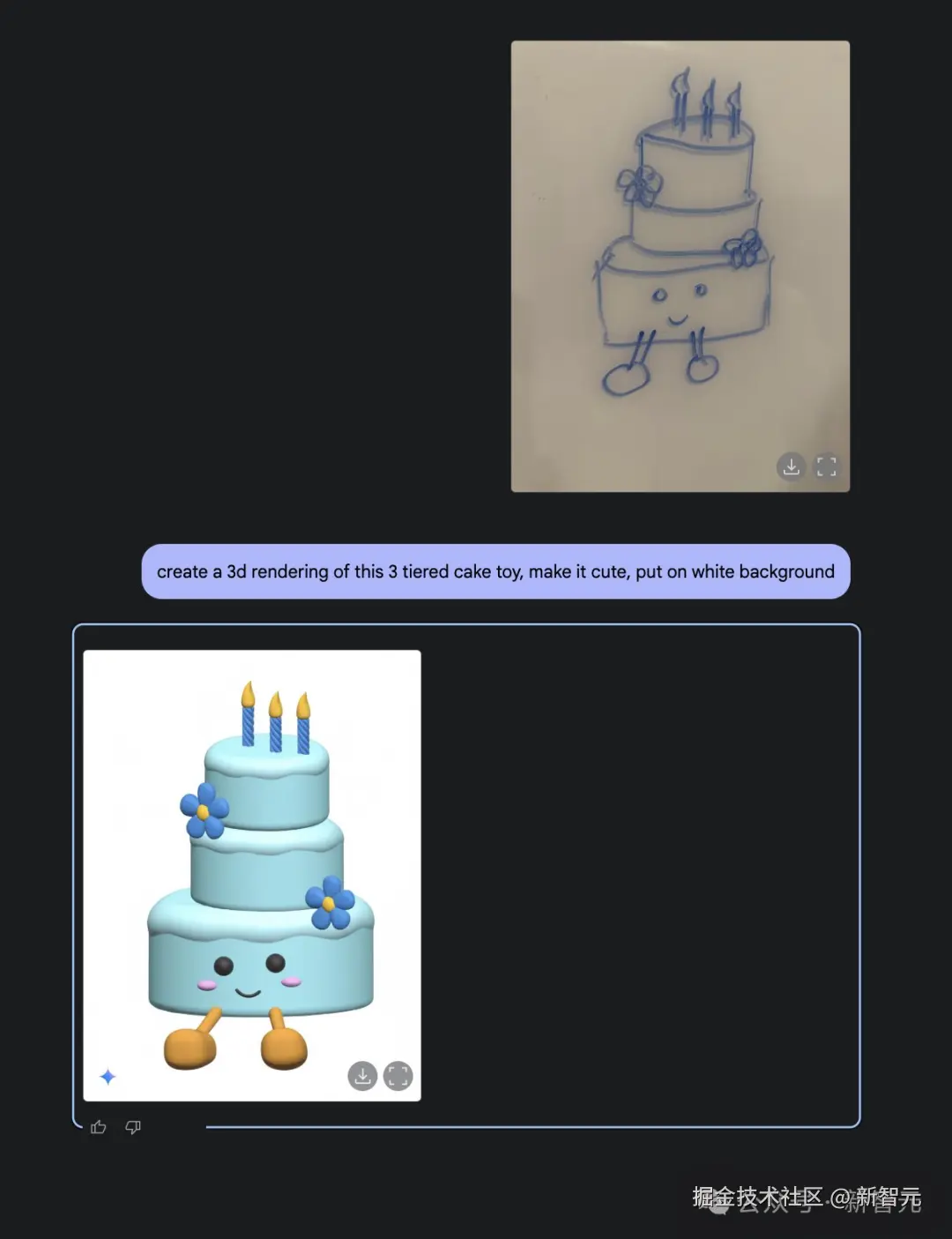 他首先用 Gemini 2.0 Flash Image 将妻子画的三层蛋糕转换成 3D 渲染图。