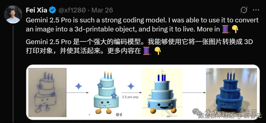 「Gemini 2.5 Pro 是一个强大的编码模型。我能够使用它将一张图片转换成 3D 打印对象,并使其活起来!」他表示。