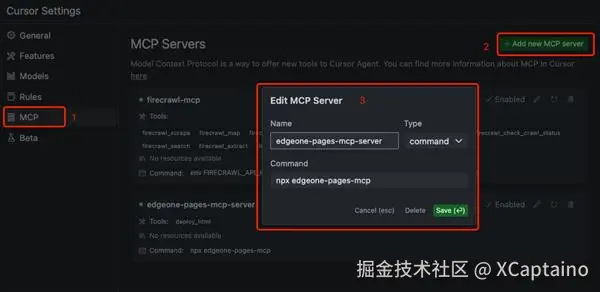 首先,在设置界面切到「MCP」,添加新的 MCP Server,填入如下配置:
