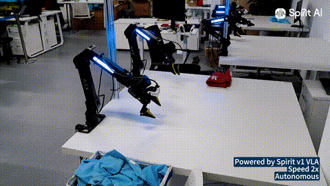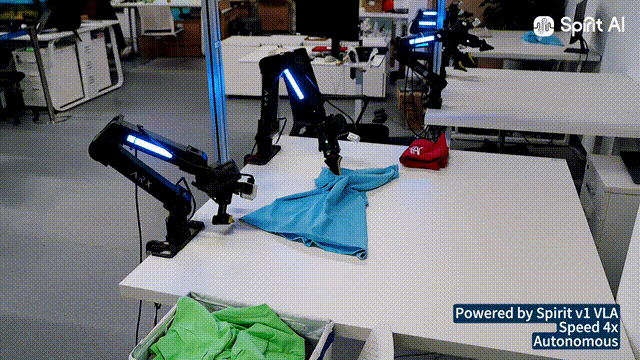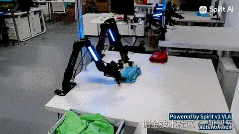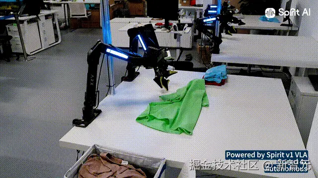 千寻机械臂成功完成从抓取、铺平、折叠,再到堆叠全流程叠衣服操作,这一跨越式进化背后,核心便在于 Spirit v1。