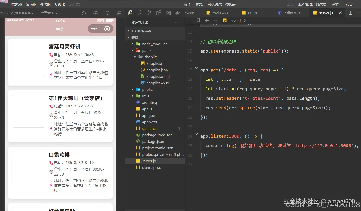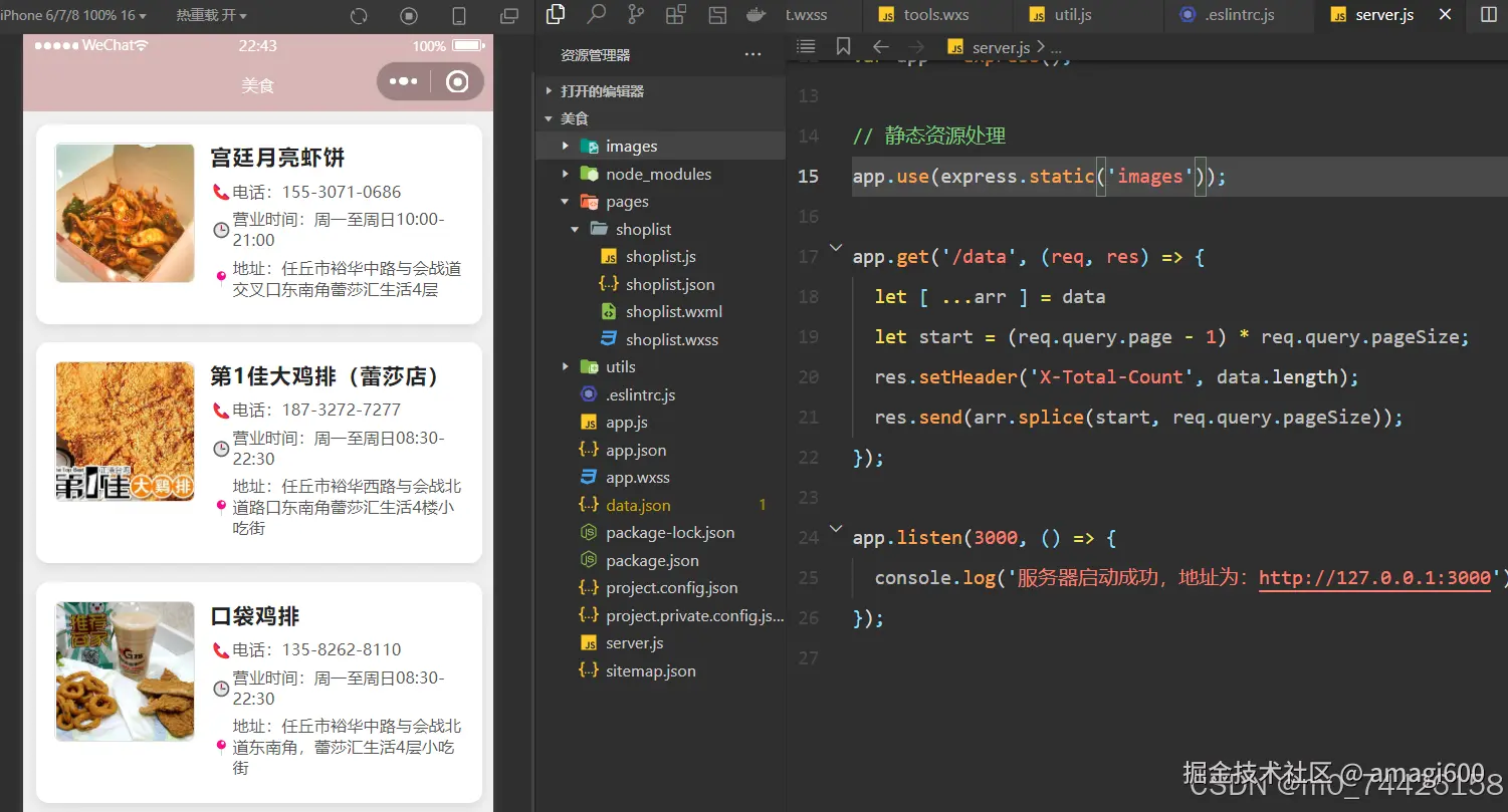在博主自己在完成案例3-3的美食列表时,许遇到这样的问题:明明图片已经放在项目目录中,但页面始终无法正常加载。比如下面是目录结构、运行界面截图:
