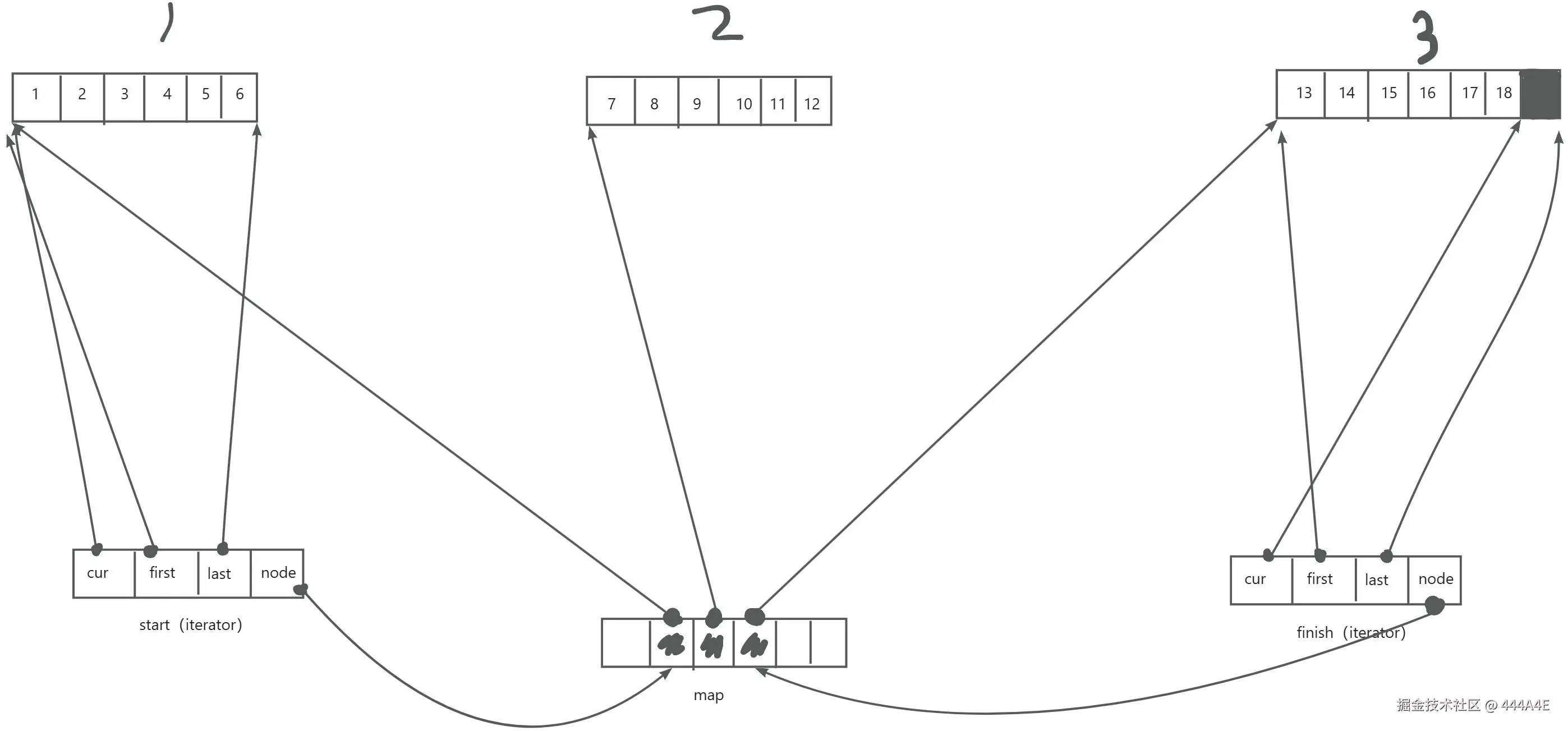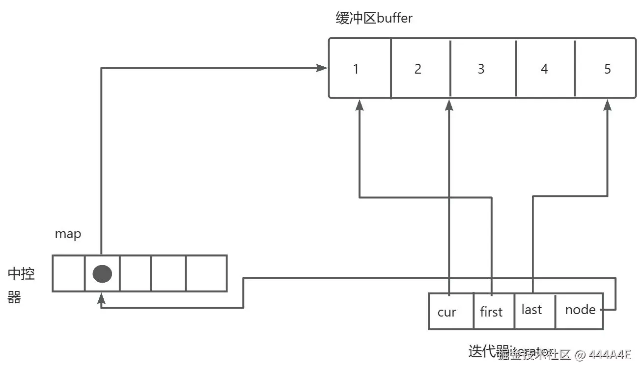 遍历的话:开始迭代器 start 中的 cur 从 first 的位置开始走,当遇到 last 时,当前1号数组遍历完; start 整体指向2号数组,start 中的 first 指向2号数组的开始,再重复刚才的步骤,直到 start 中的 cur 遇到结束迭代器 finish 中的 last, 此时便遍历完了整个 deque。