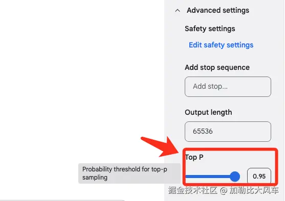 - Advanced Settings (高级设置): 包括安全设置、停止序列、输出长度、Top P(后面会详细讲!)。