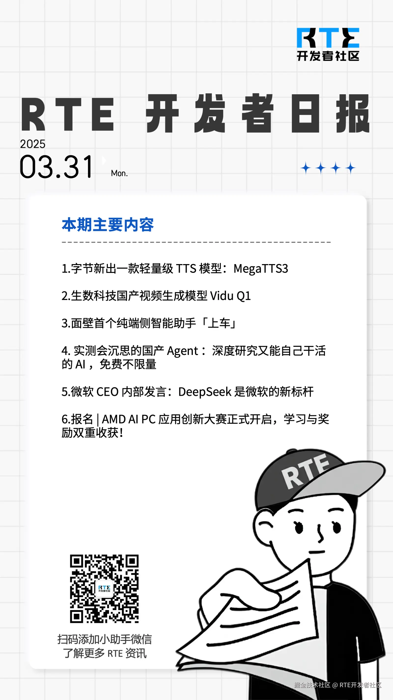 这里是 「RTE 开发者日报」 ,每天和大家一起看新闻、聊八卦。我们的社区编辑团队会整理分享 RTE(Real-Time Engagement) 领域内「有话题的 技术 」、「有亮点的 产品 」、「有思考的 文章 」、「有态度的 观点 」、「有看点的 活动 」,但内容仅代表编辑的个人观点,欢迎大家留言、跟帖、讨论。
