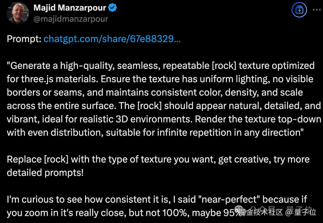 GPT-4o 还被发现可以生成近乎完美的无缝材质贴图,也就是在任何方向上都可以无限重复,可以配合 AI 代码生成开发游戏。