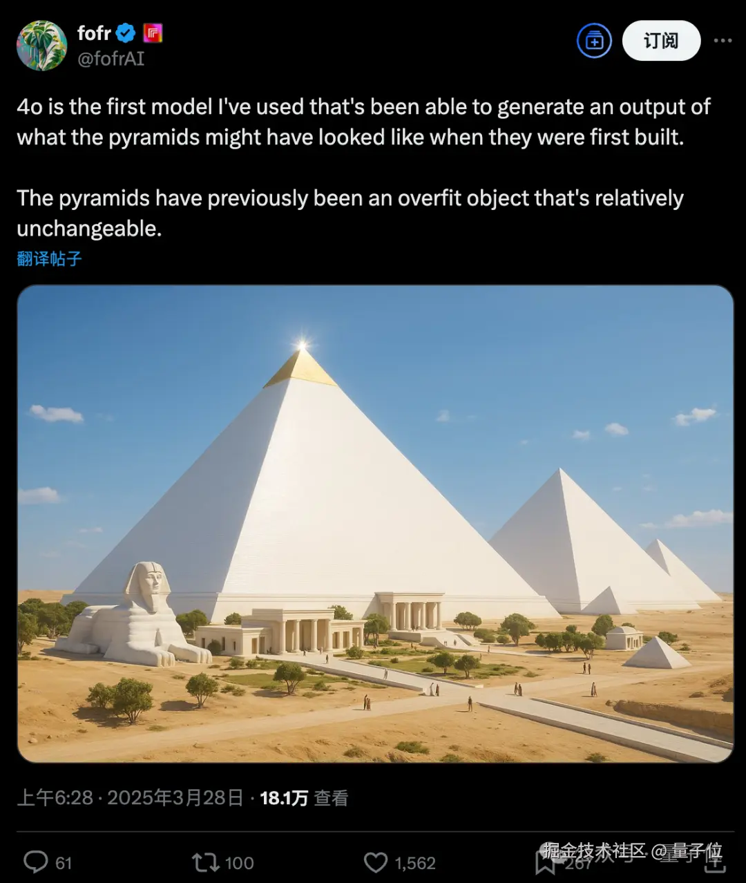 再比如可以生成金字塔最初建造时的样子,这里的难点在于金字塔数千年后的照片太多了,此前在其他 AI 生图模型中大多是过拟合的。