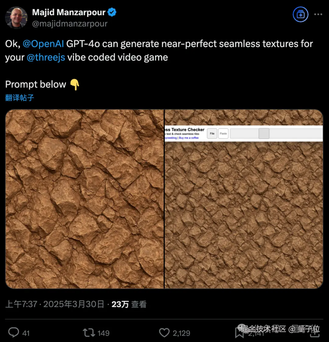 GPT-4o 还被发现可以生成近乎完美的无缝材质贴图,也就是在任何方向上都可以无限重复,可以配合 AI 代码生成开发游戏。