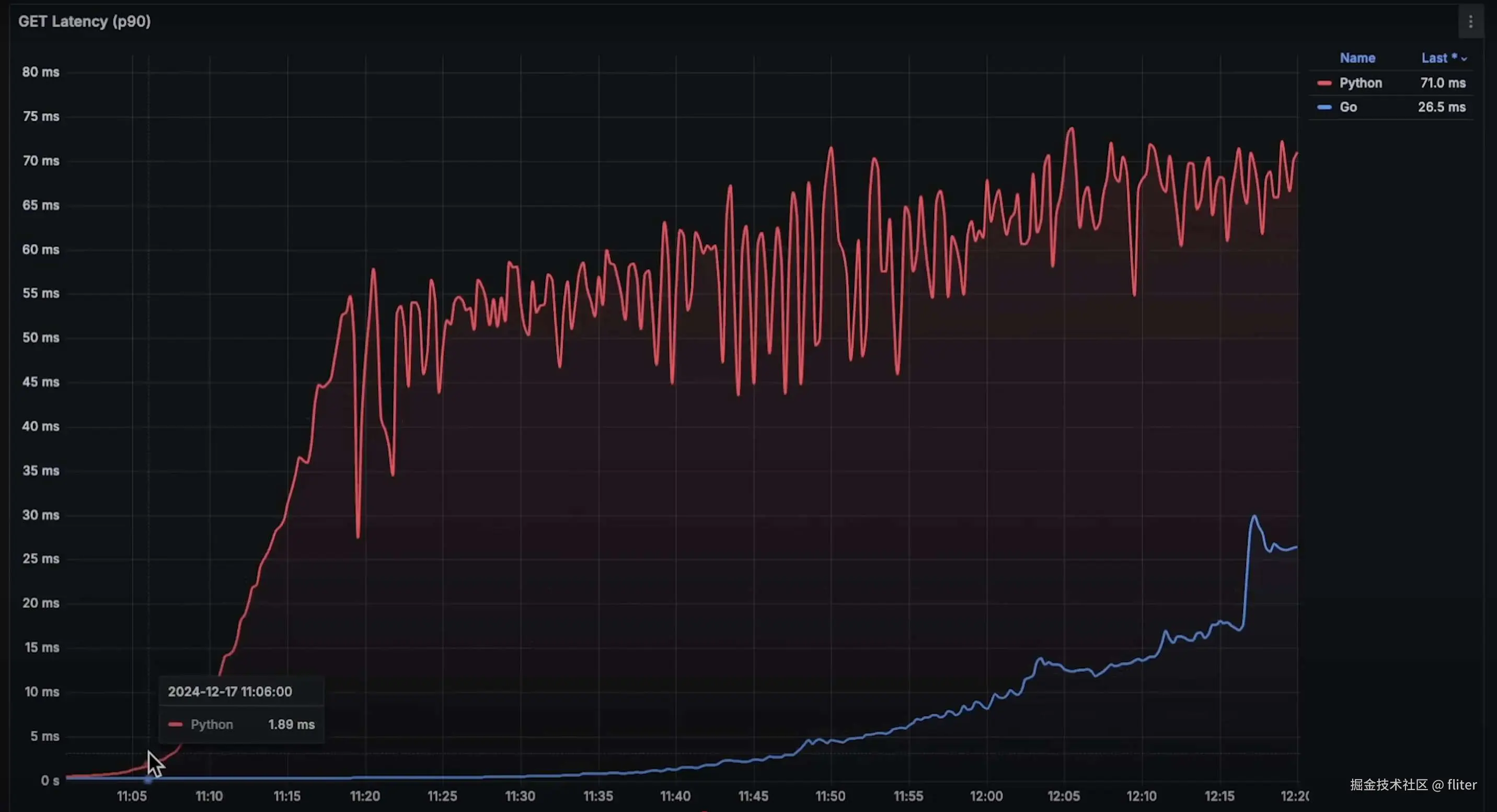 - Python 达到了 每秒 11,000 请求,而 Go 达到了 每秒 66,000 请求。