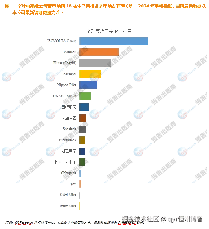 根据QYResearch头部企业研究中心调研,全球范围内电绝缘云母带生产商主要包括ISOVOLTA Group、VonRoll、Elinar (Cogebi)、Krempel、Nippon Rika等。2024年,全球前五大厂商占有大约54.0%的市场份额。
