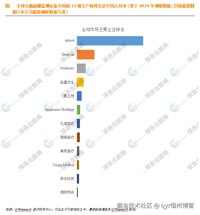 根据QYResearch头部企业研究中心调研,全球范围内无痛血糖监测设备生产商主要包括Abbott、DexCom、Medtronic、硅基仿生、凯立特等。2024年,全球前五大厂商占有大约11.0%的市场份额。
