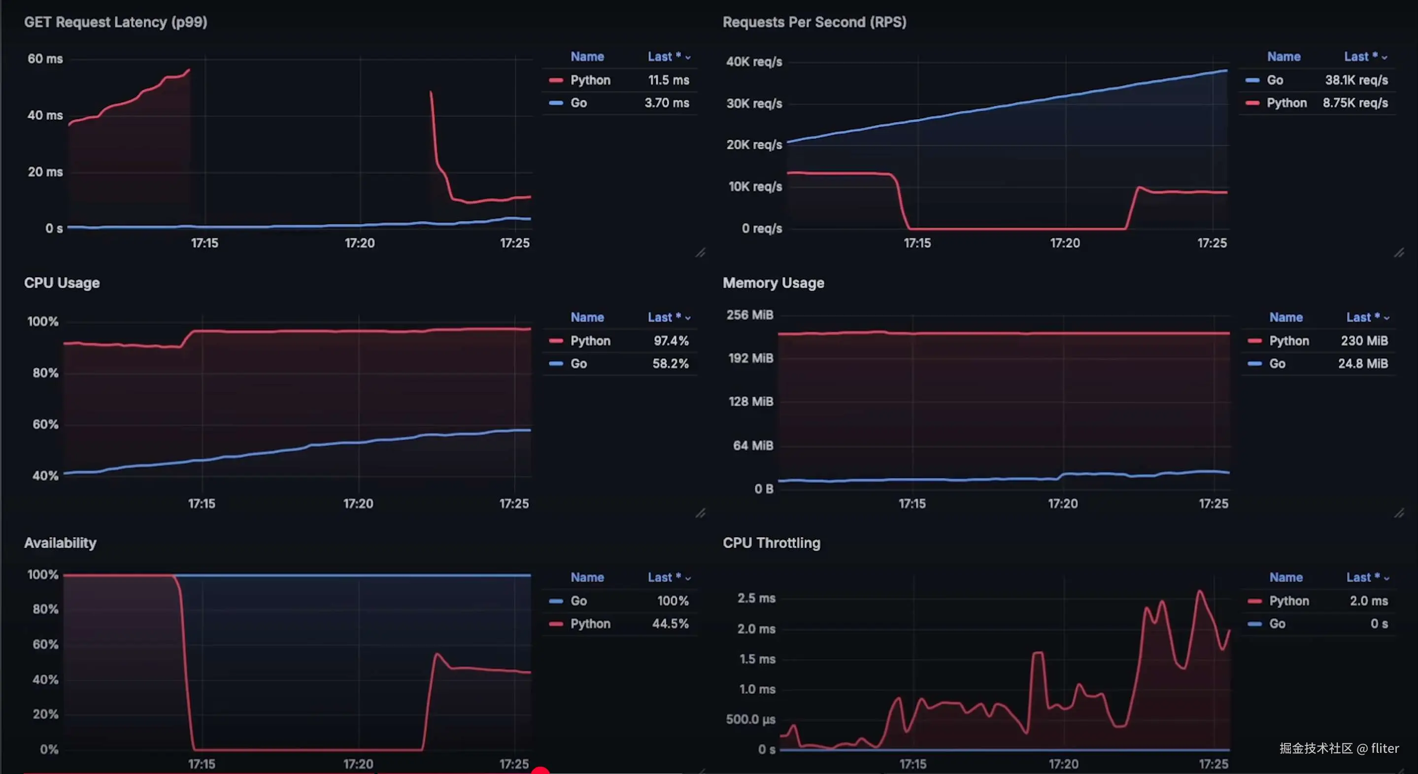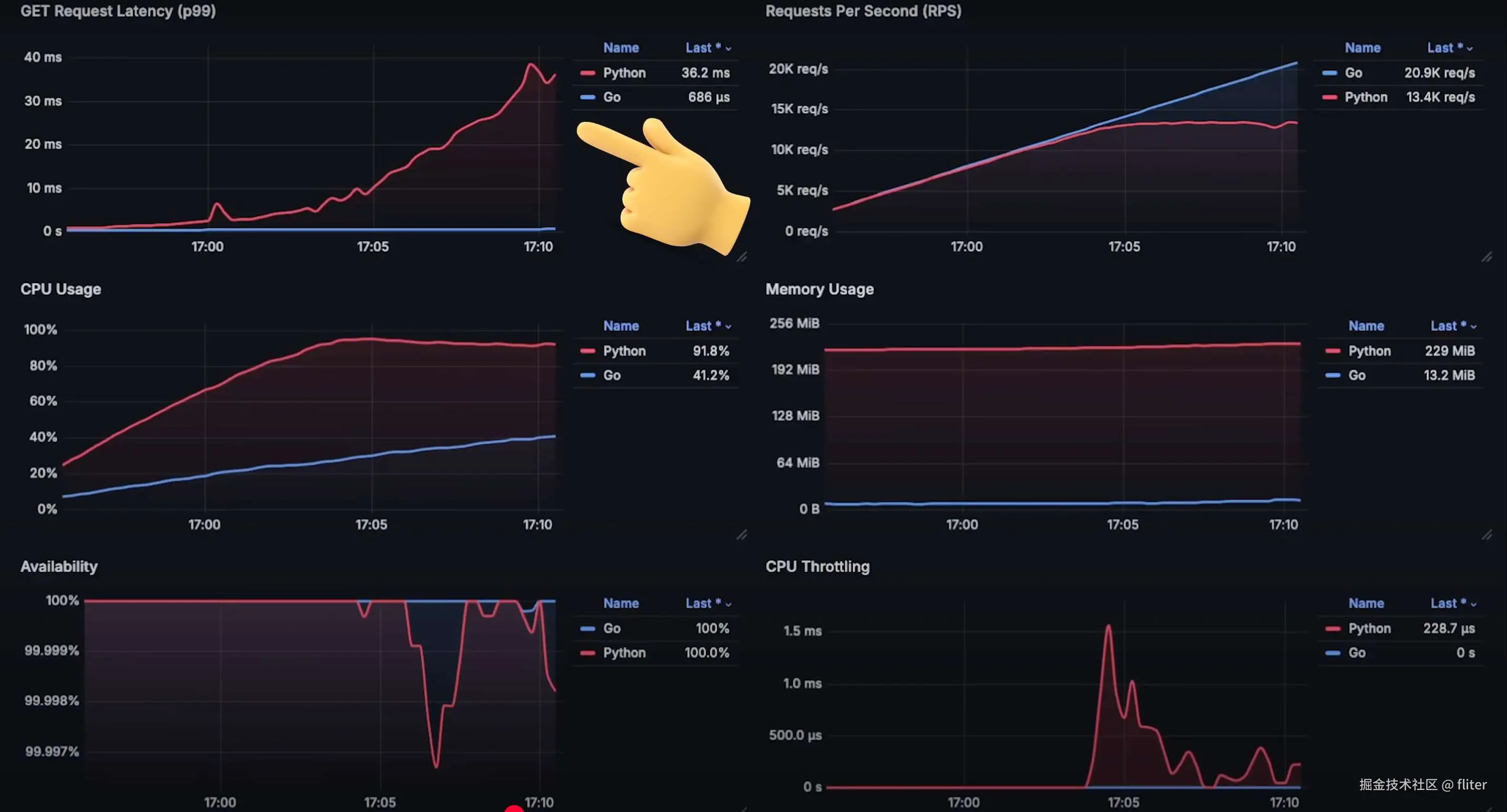 - Python 服务器过载,导致 可用性降至 0。