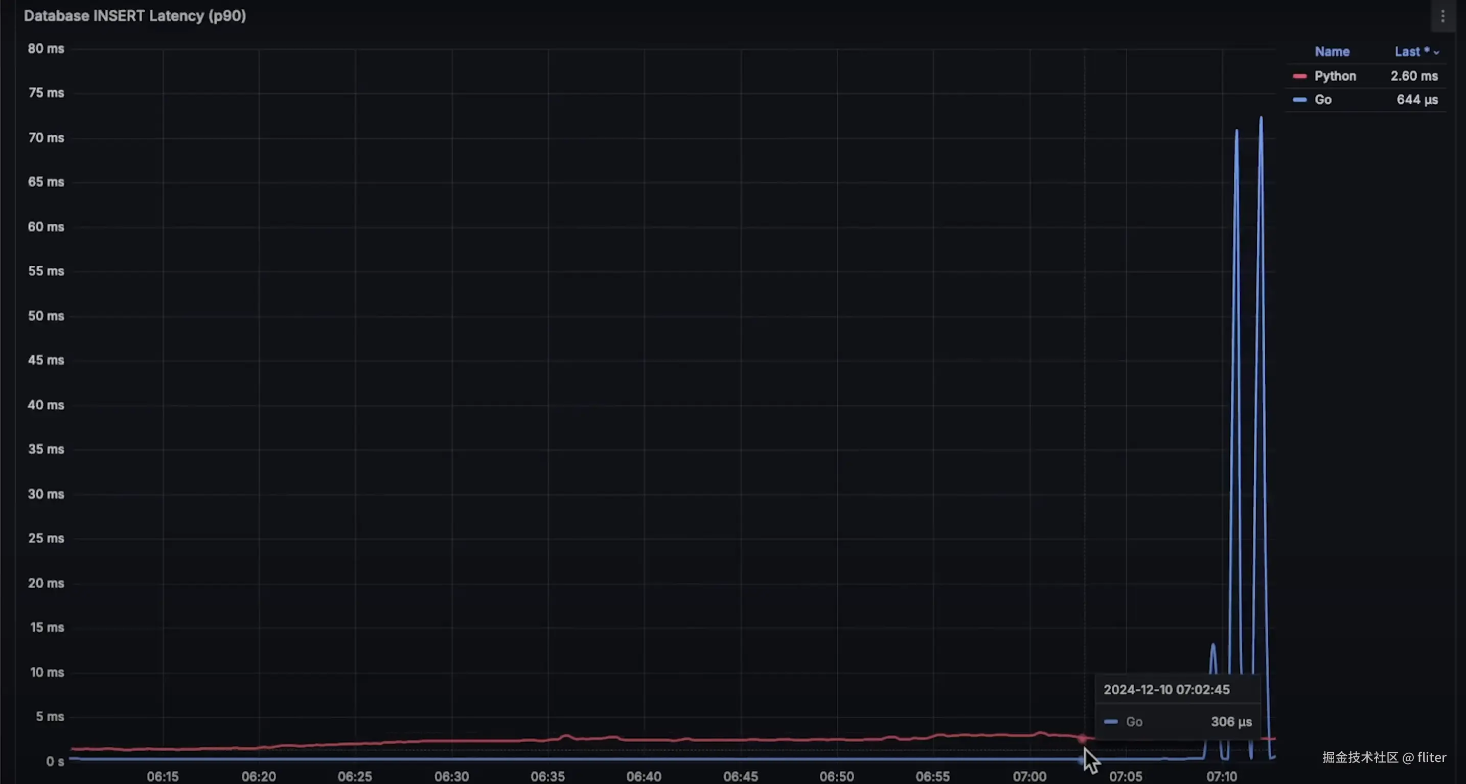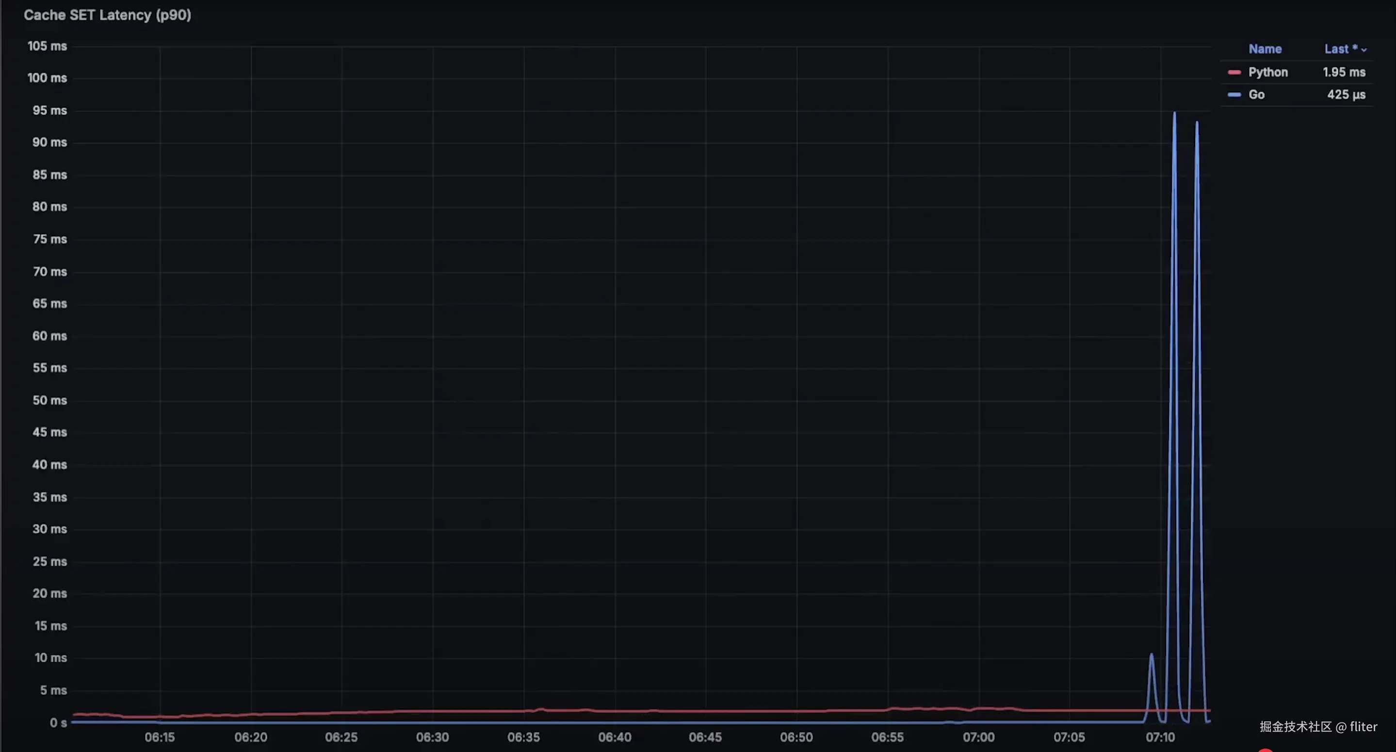 为了更细致地分析性能,我使用 Prometheus 监测每个应用的关键操作,例如 数据库插入 和 缓存存取。此外,我们还会测量: